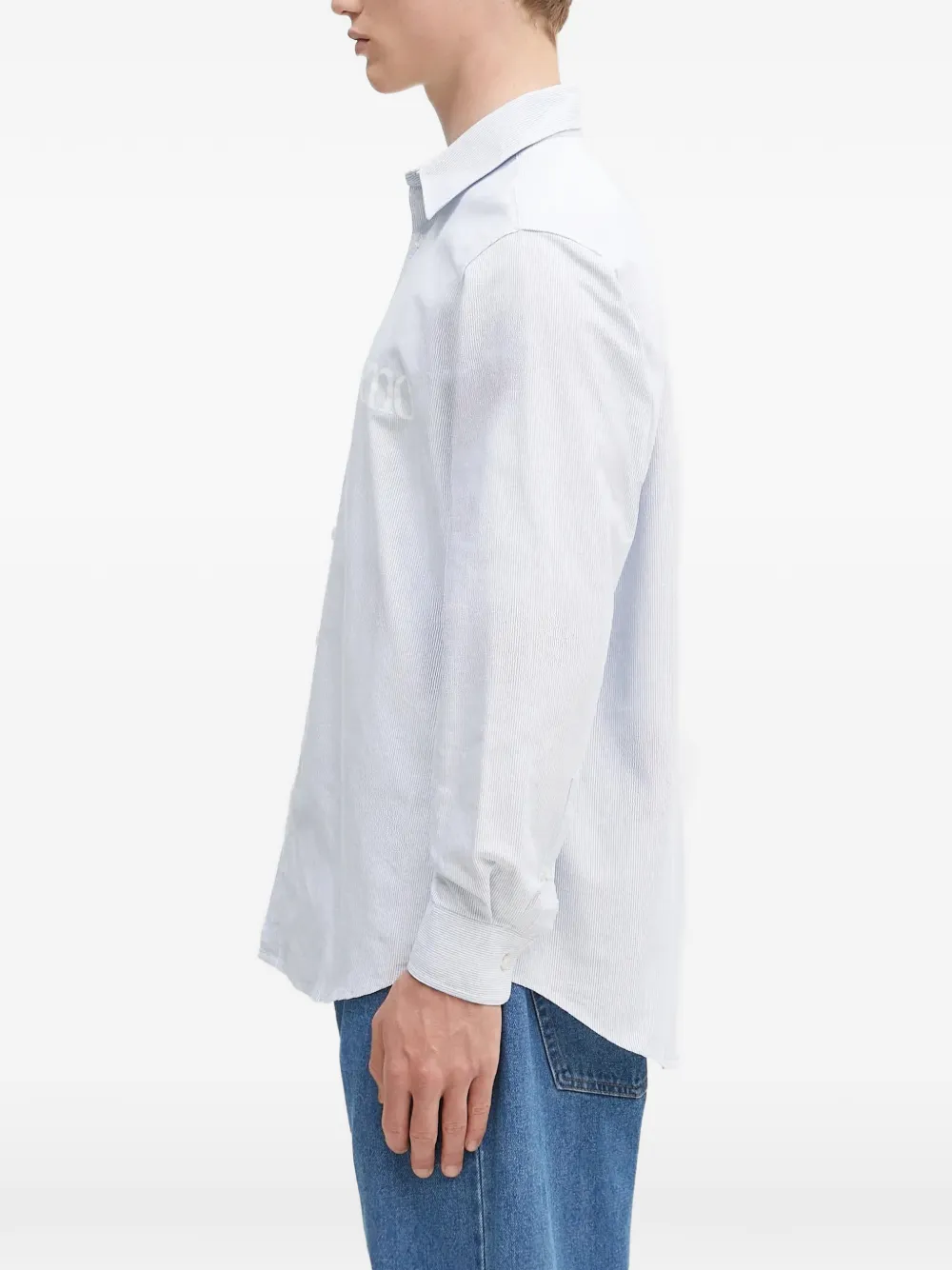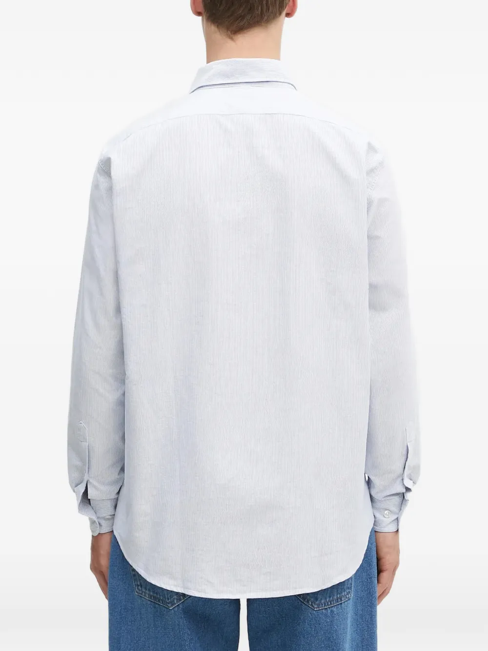 Синий с полосатым узором, застежка на пуговицы, длинные рукава, манжеты на пуговицах