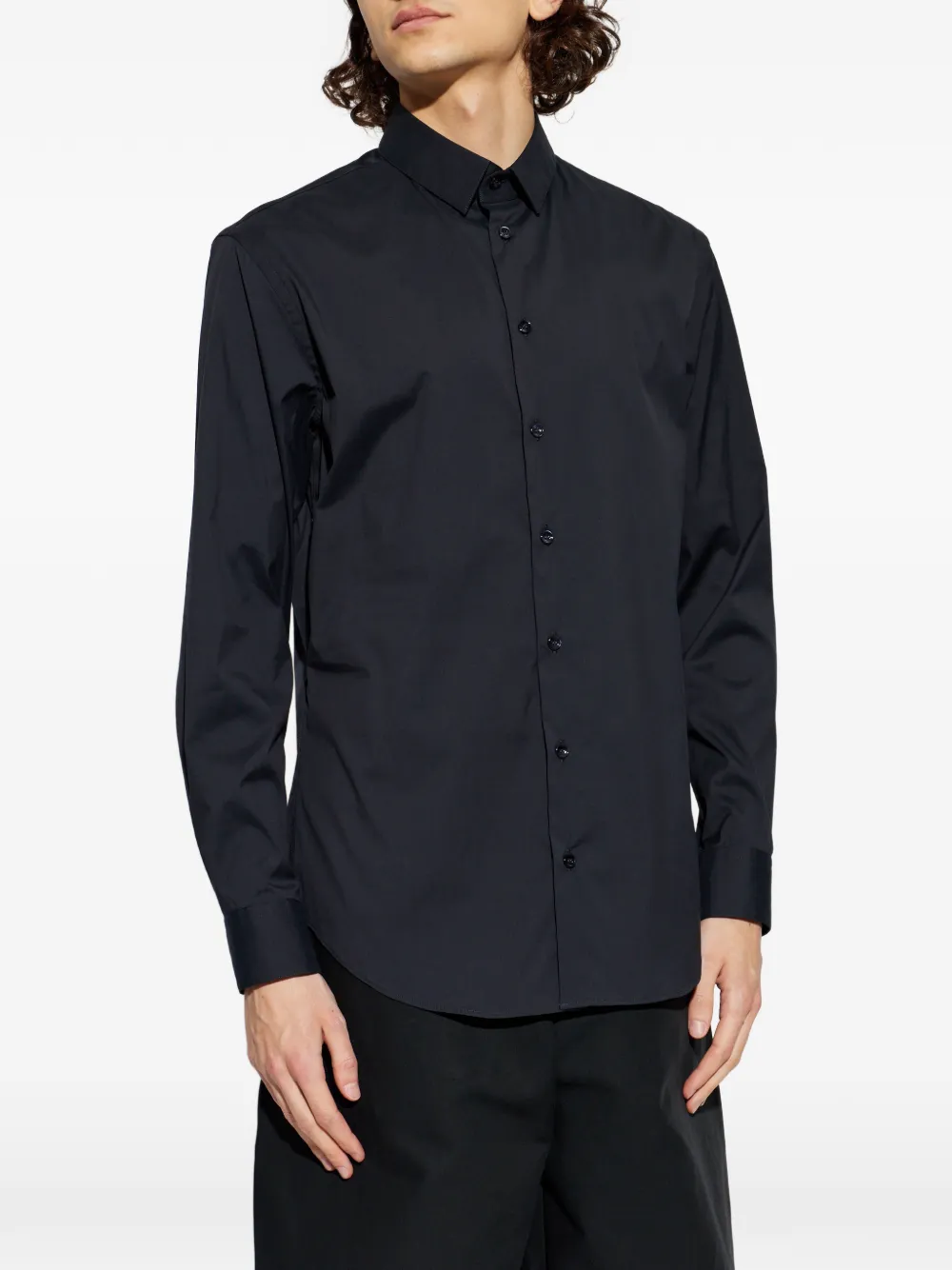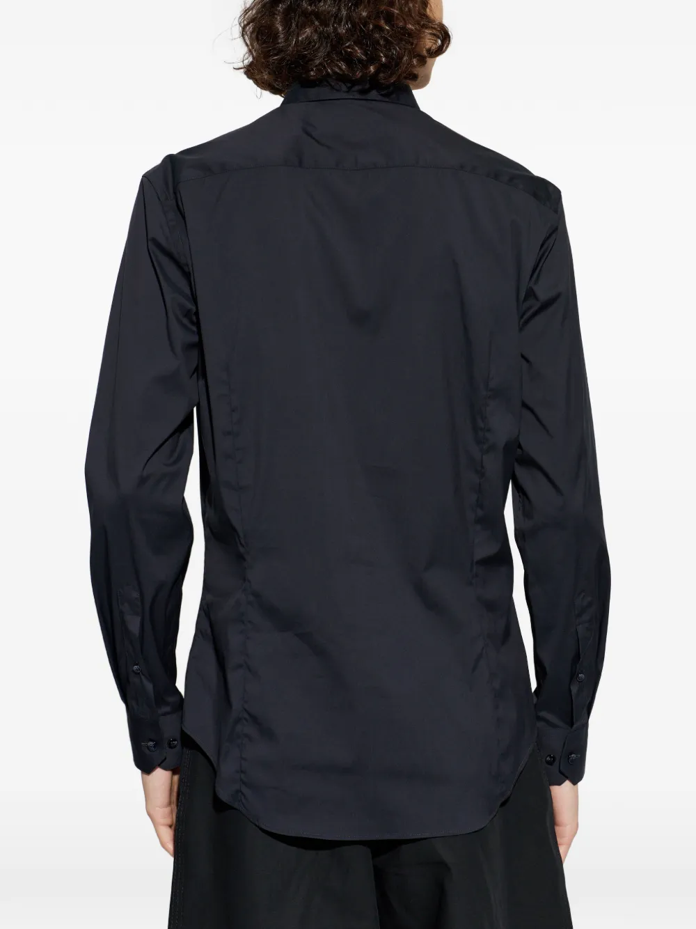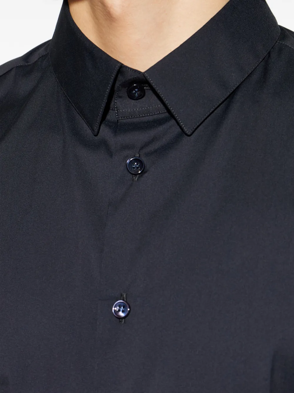 Темно-синий, застегивающийся на пуговицы, длинные рукава, манжеты на пуговицах, классический воротник, изогнутый подол