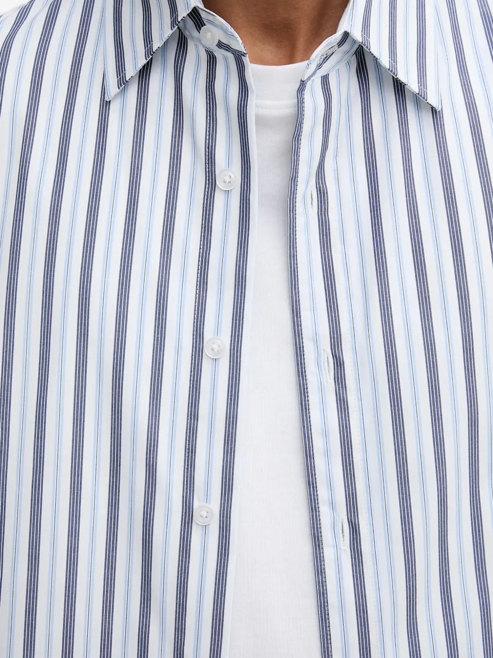 Синий в полоску, застежка на пуговицы, манжеты на пуговицах, воротник пола, длинные рукава