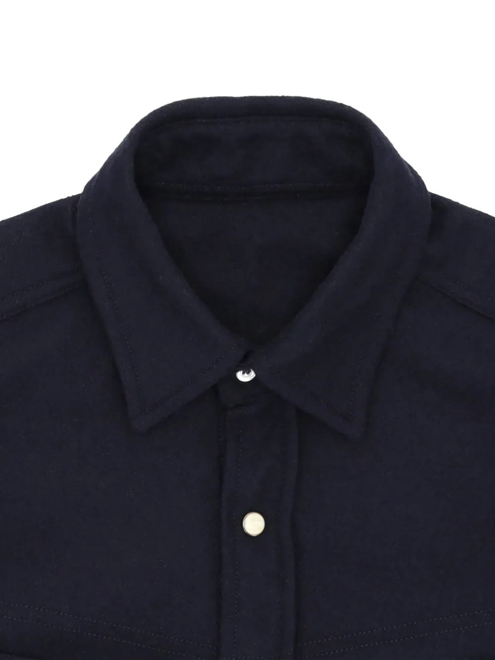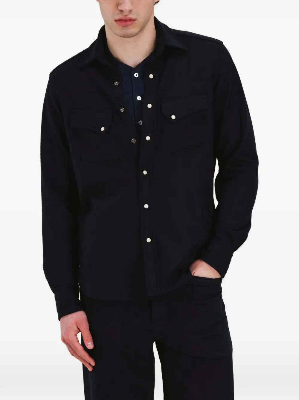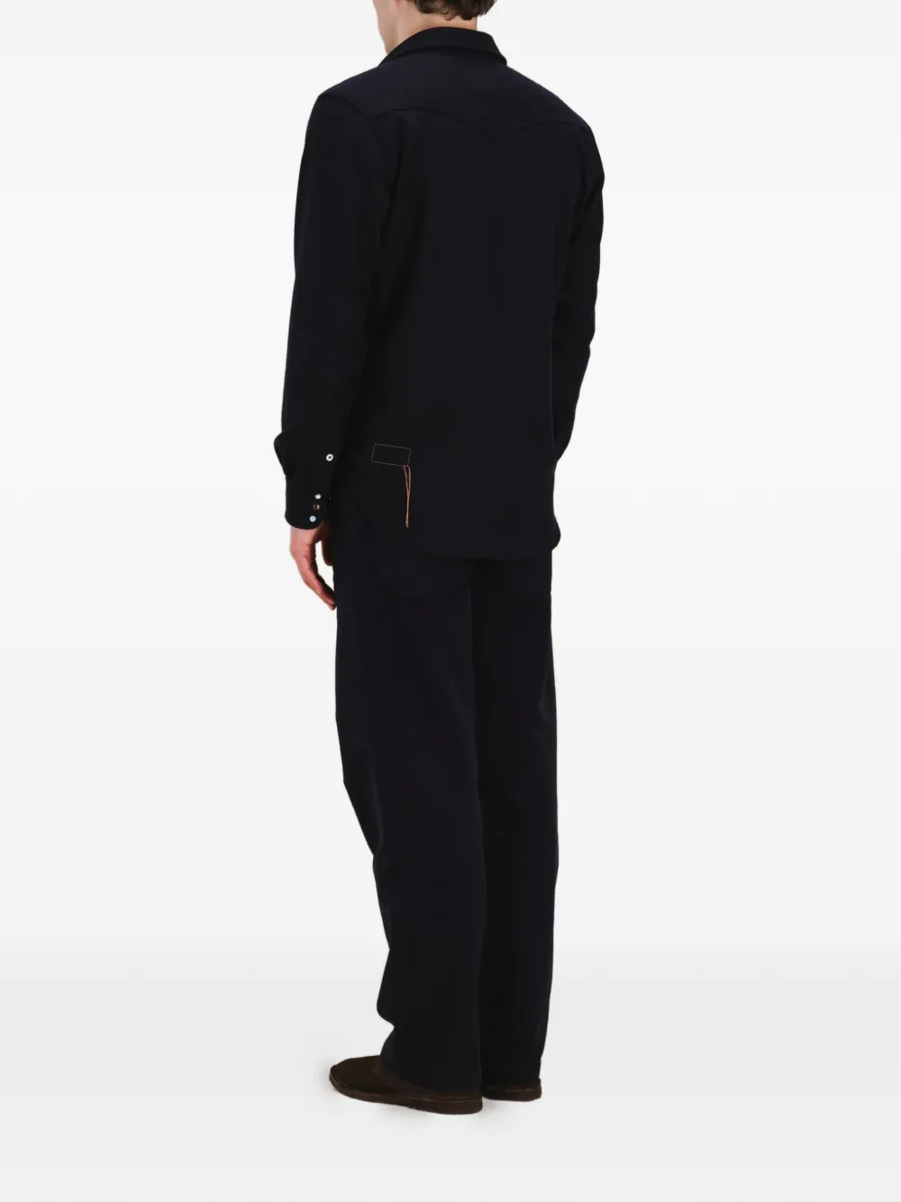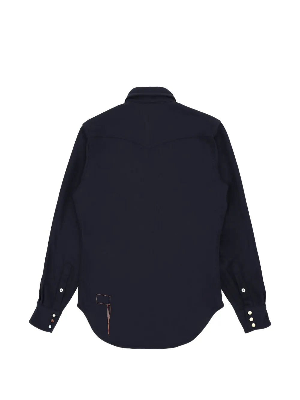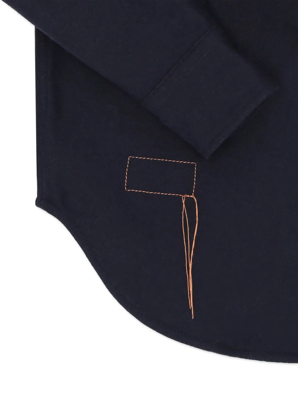 Синие накладные карманы на груди, контрастная строчка, манжеты на пуговицах, закругленный подол