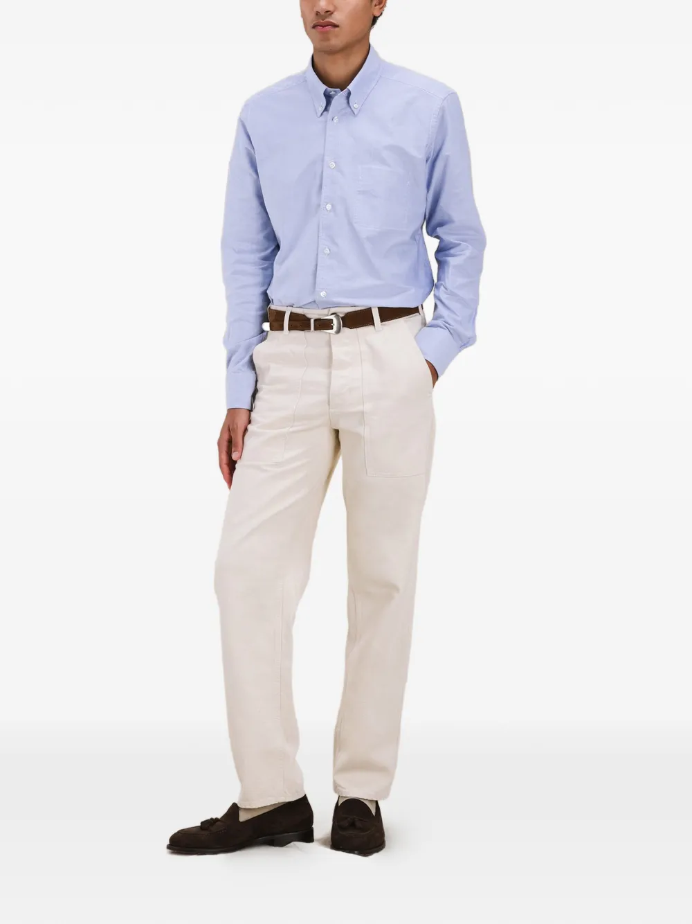 Светло-голубой, застежка на пуговицы, воротник на пуговицах, закругленный подол, собранные манжеты