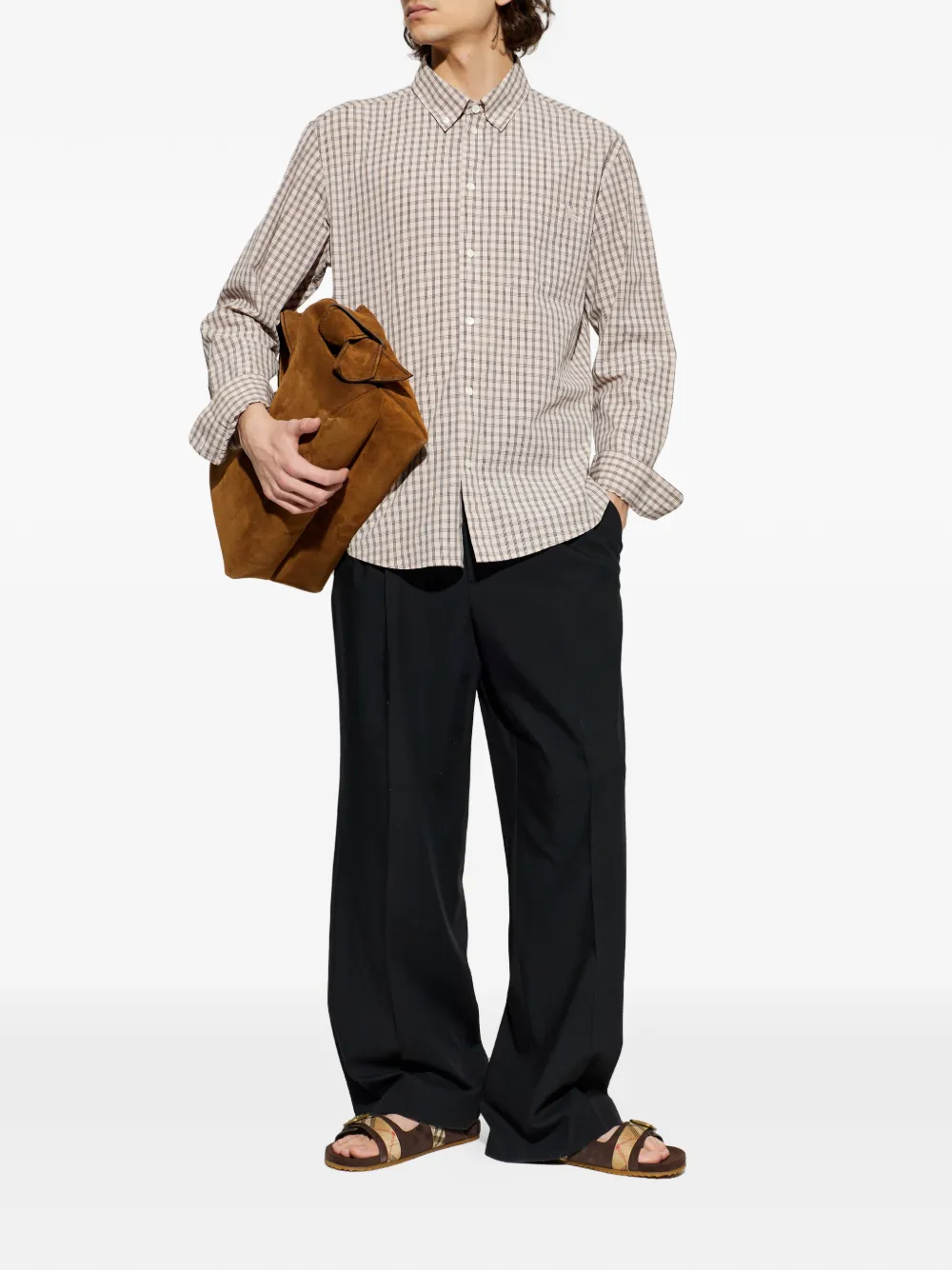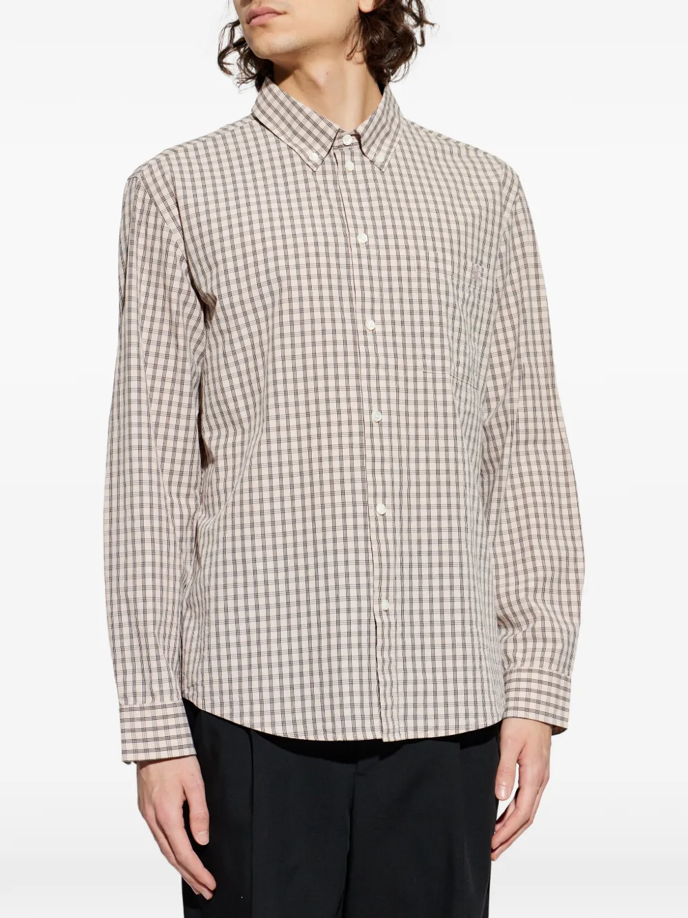 Бежево-черная клетка, нагрудный карман, застежка на пуговицы, длинные рукава, манжеты на пуговицах