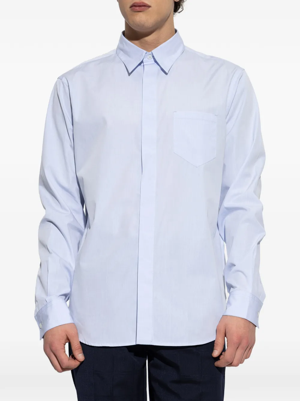 Синий цвет, нагрудный карман, застежка на пуговицы, отложной воротник, длинные рукава, манжеты на пуговицах