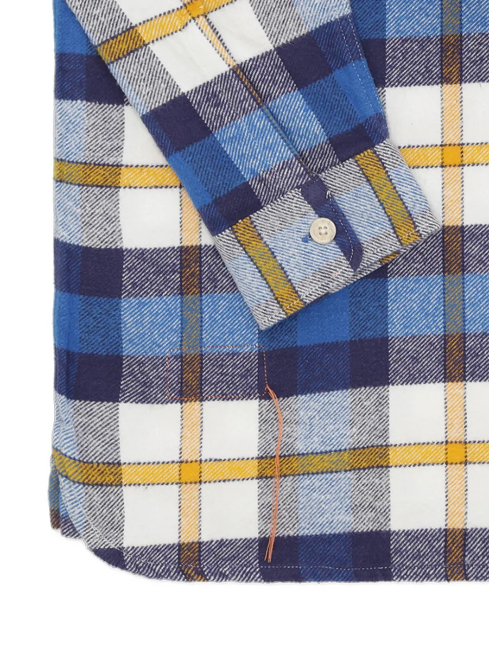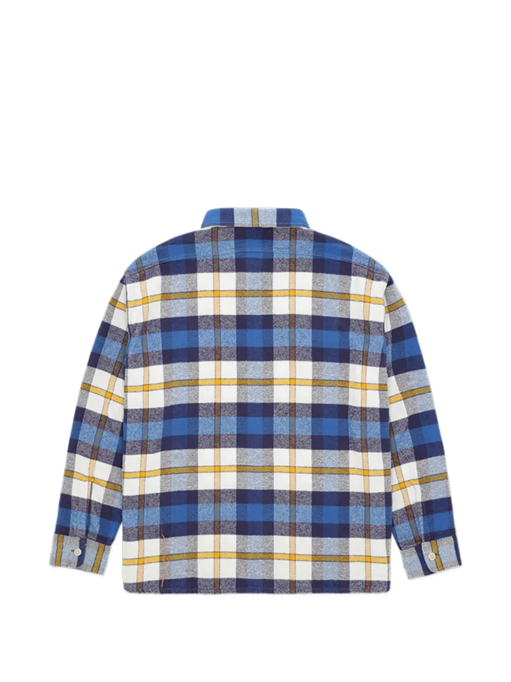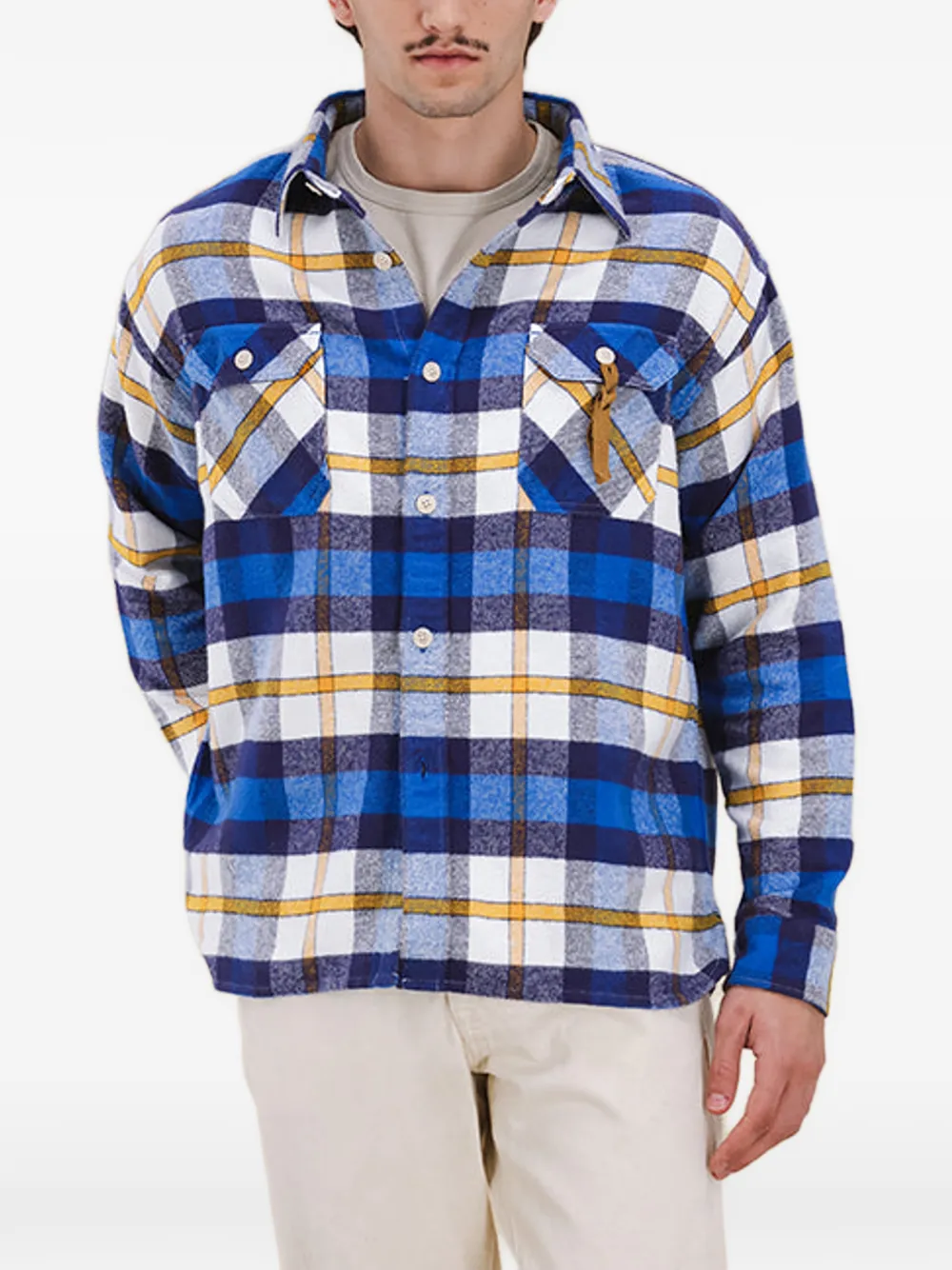 Синий и разноцветный клетчатый узор, застежка на пуговицы спереди, накладные нагрудные карманы, отделка лентой