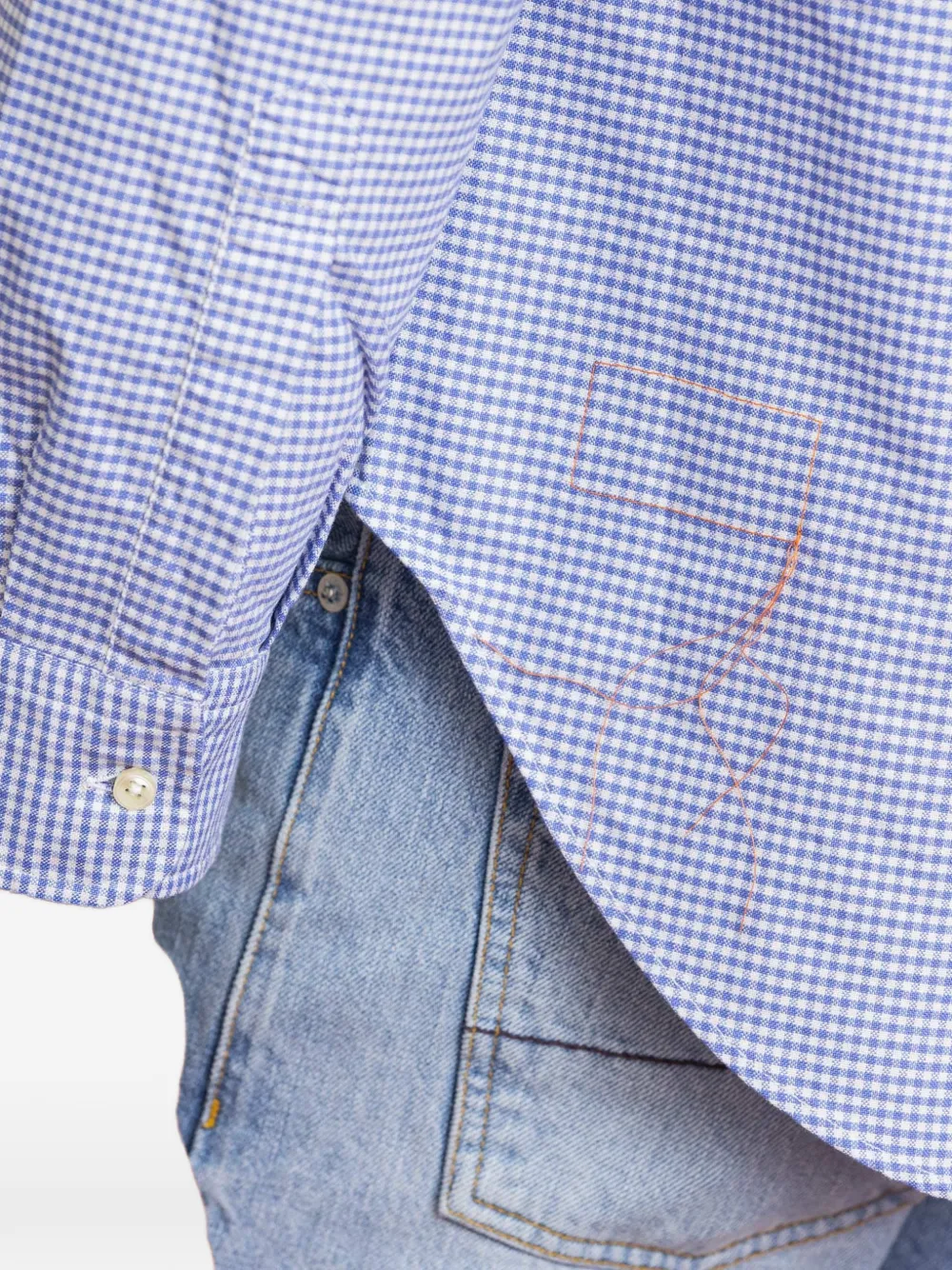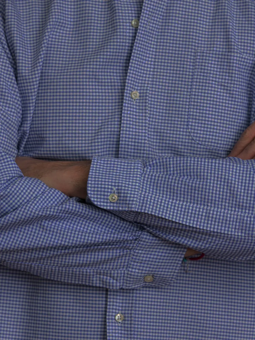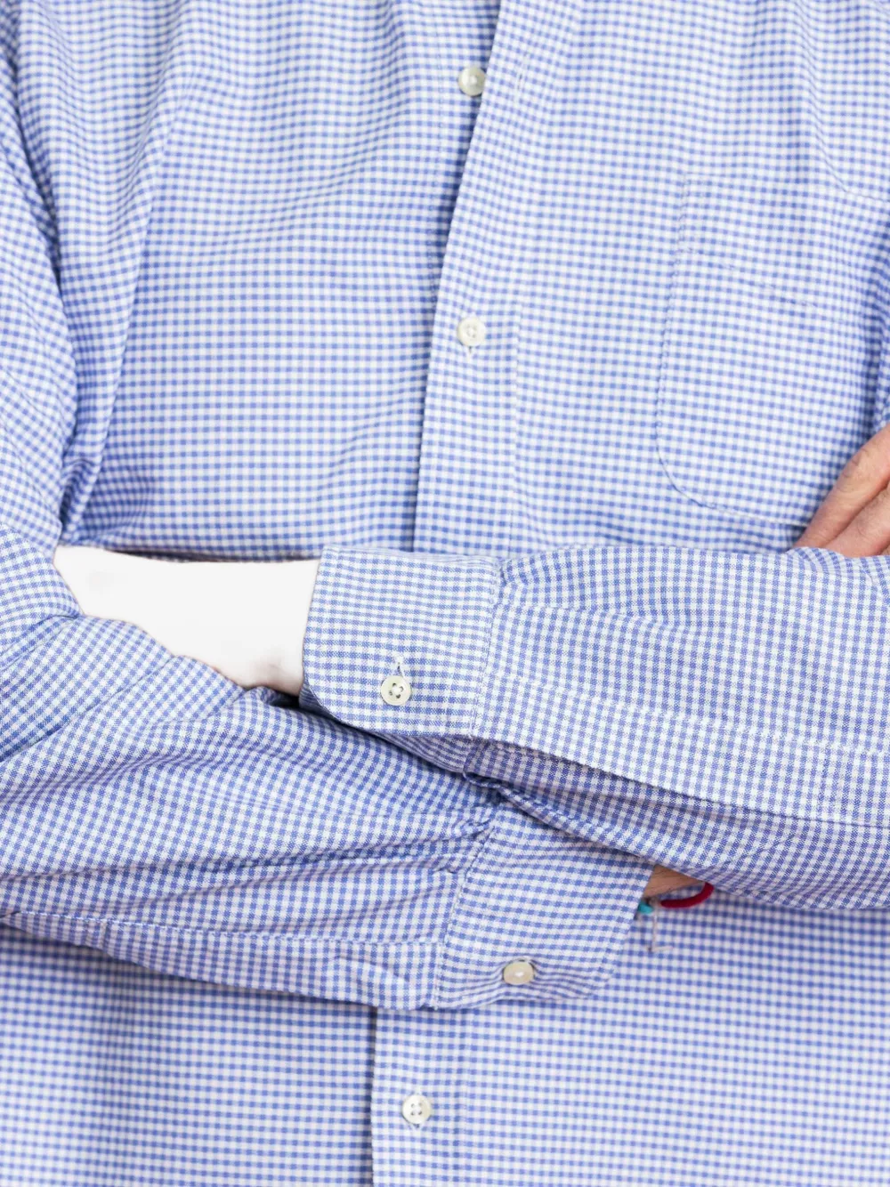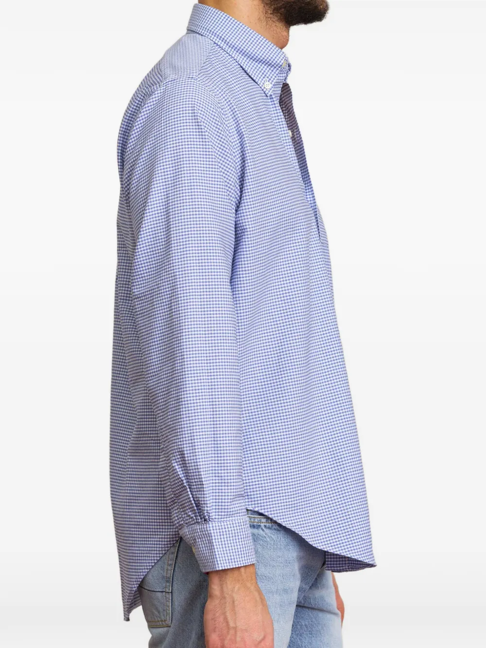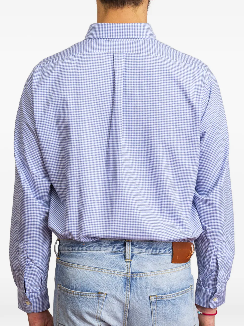Голубая рубашка в клетку с воротником на пуговицах, нагрудным карманом, длинными рукавами и манжетами на пуговицах