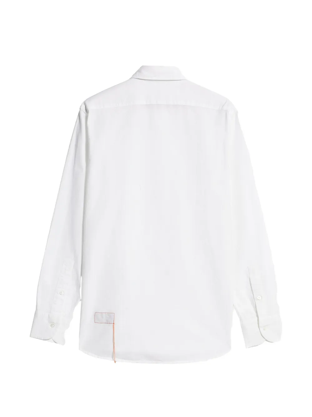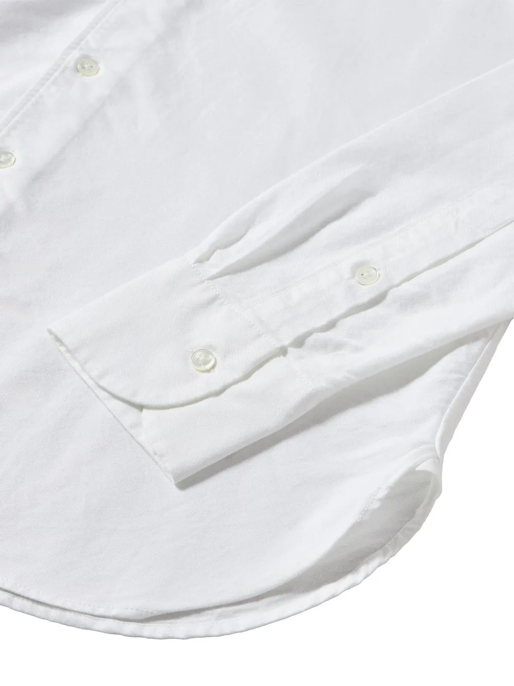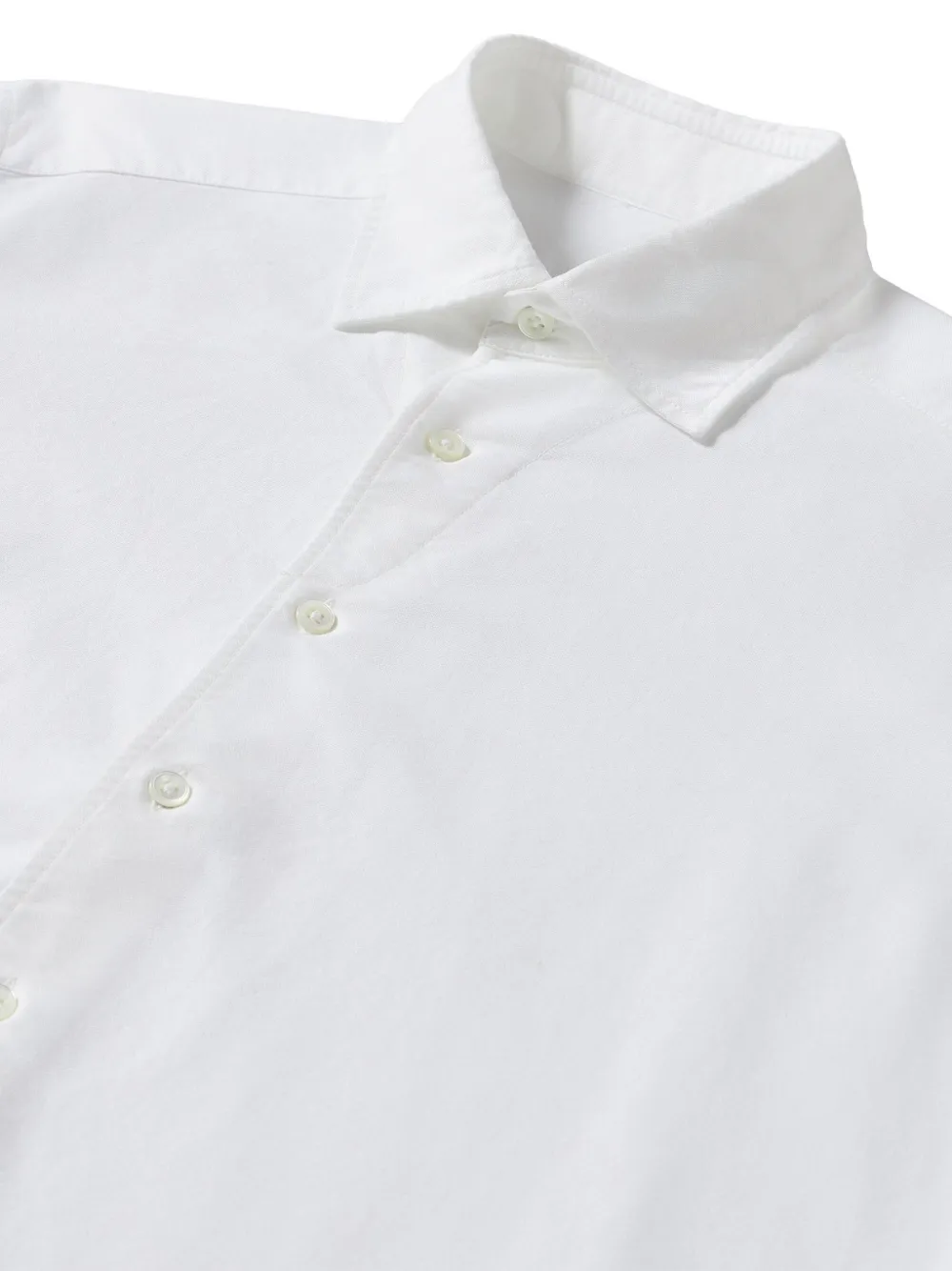Белый воротник с острыми концами, застежка на пуговицы, закругленный подол, манжеты на пуговицах, стандартный крой
