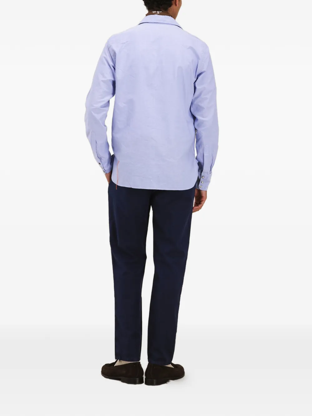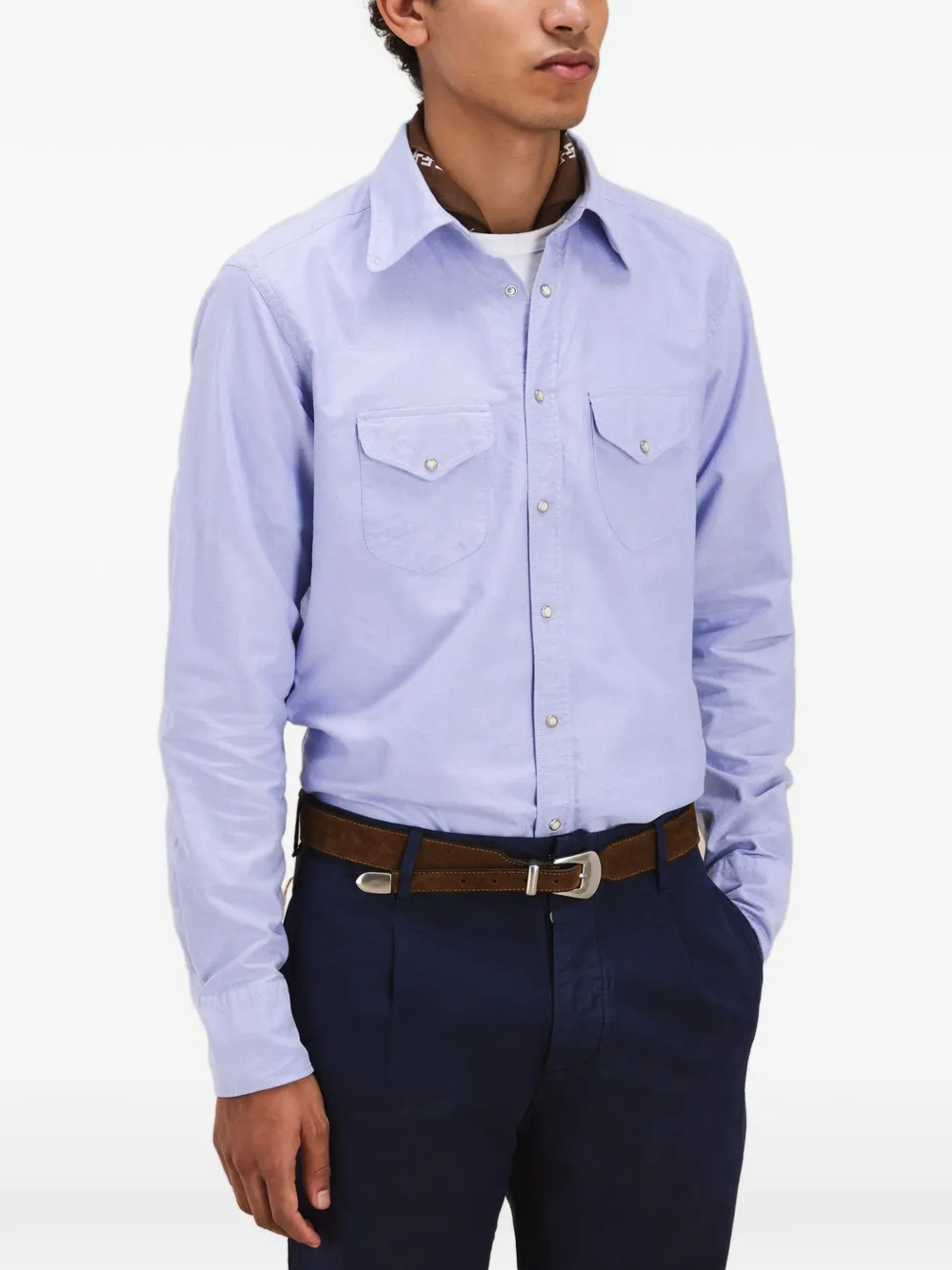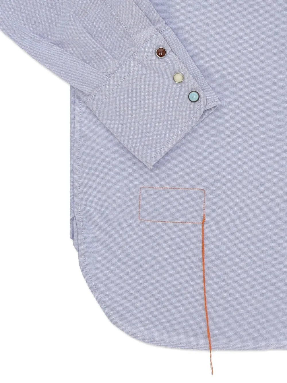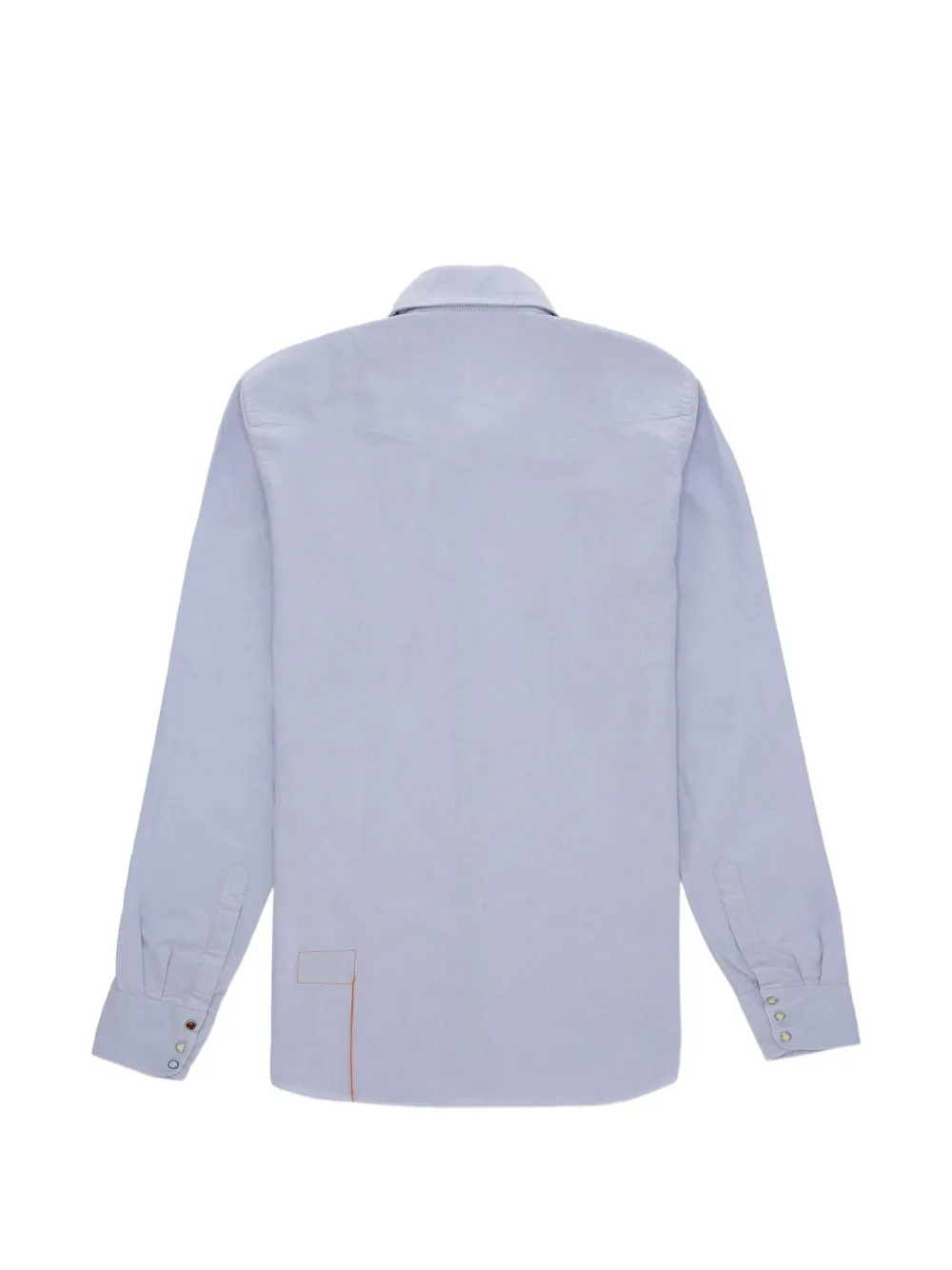Светло-голубой, нагрудные карманы с клапанами, застежка на кнопки, длинные рукава, манжеты на пуговицах, прямой низ