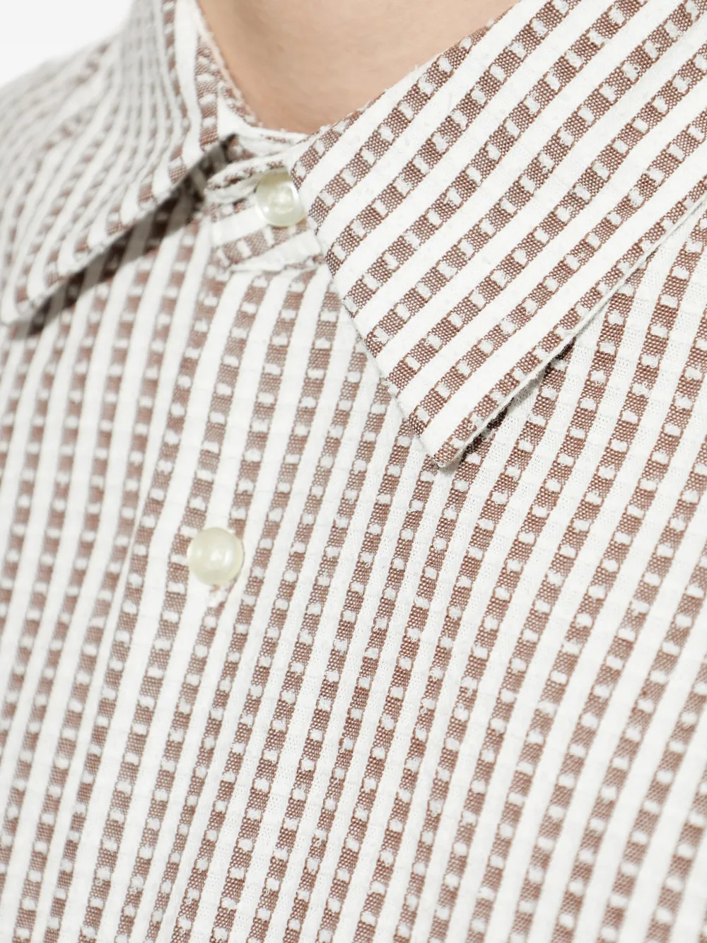 Белая и коричневая полосатая расцветка, застежка на пуговицы, длинные рукава, манжеты на пуговицах, нагрудный карман