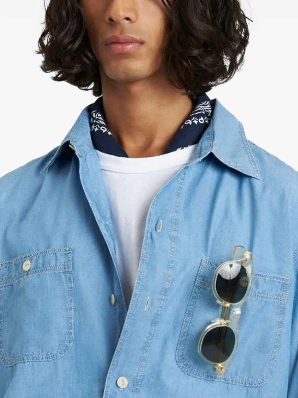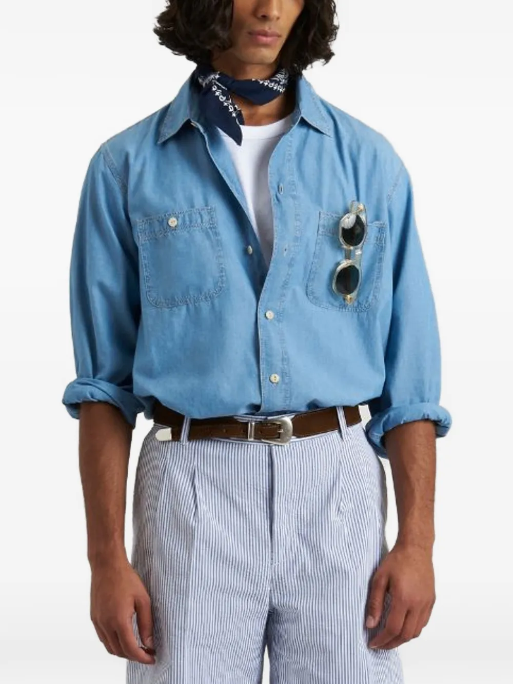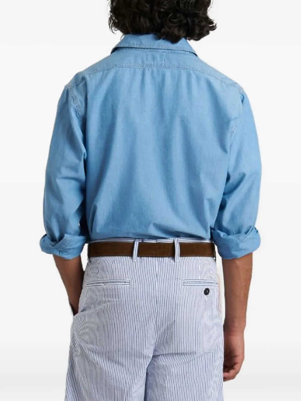 Светло-голубая хлопковая рубашка с застежкой на пуговицы, отложным воротником, длинными рукавами, нагрудными карманами и манжетами на пуговицах