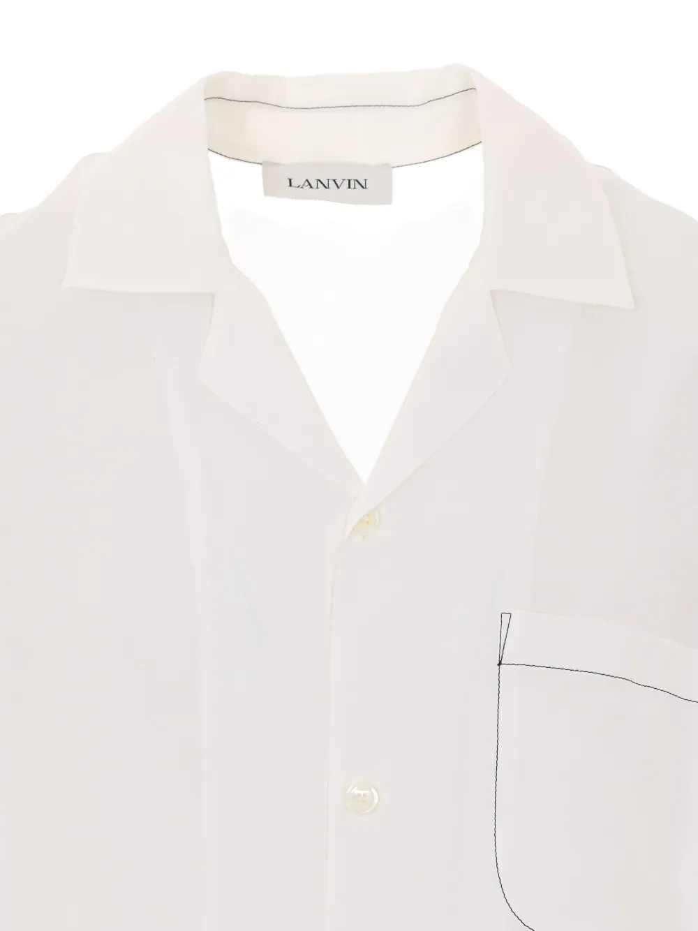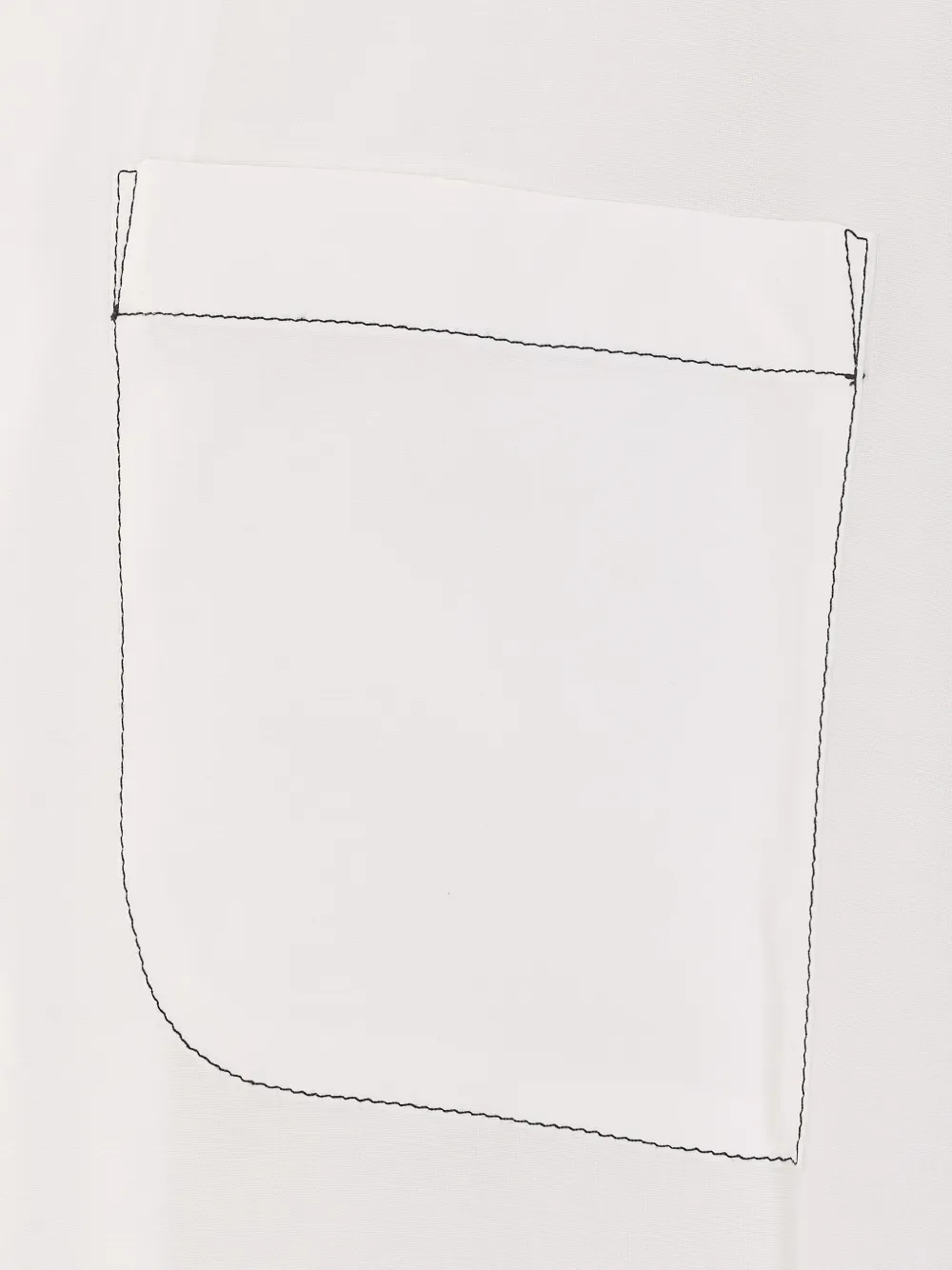 Белая рубашка с отложным воротником, короткими рукавами, застежкой на пуговицах спереди, принтом на спине и нагрудным накладным карманом