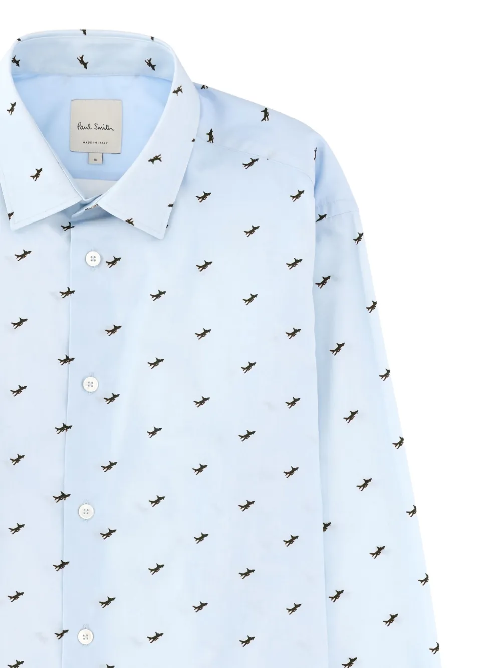 Синий цвет, застегивается на пуговицы, длинные рукава, манжеты на пуговицах, узор по всей поверхности, классический воротник