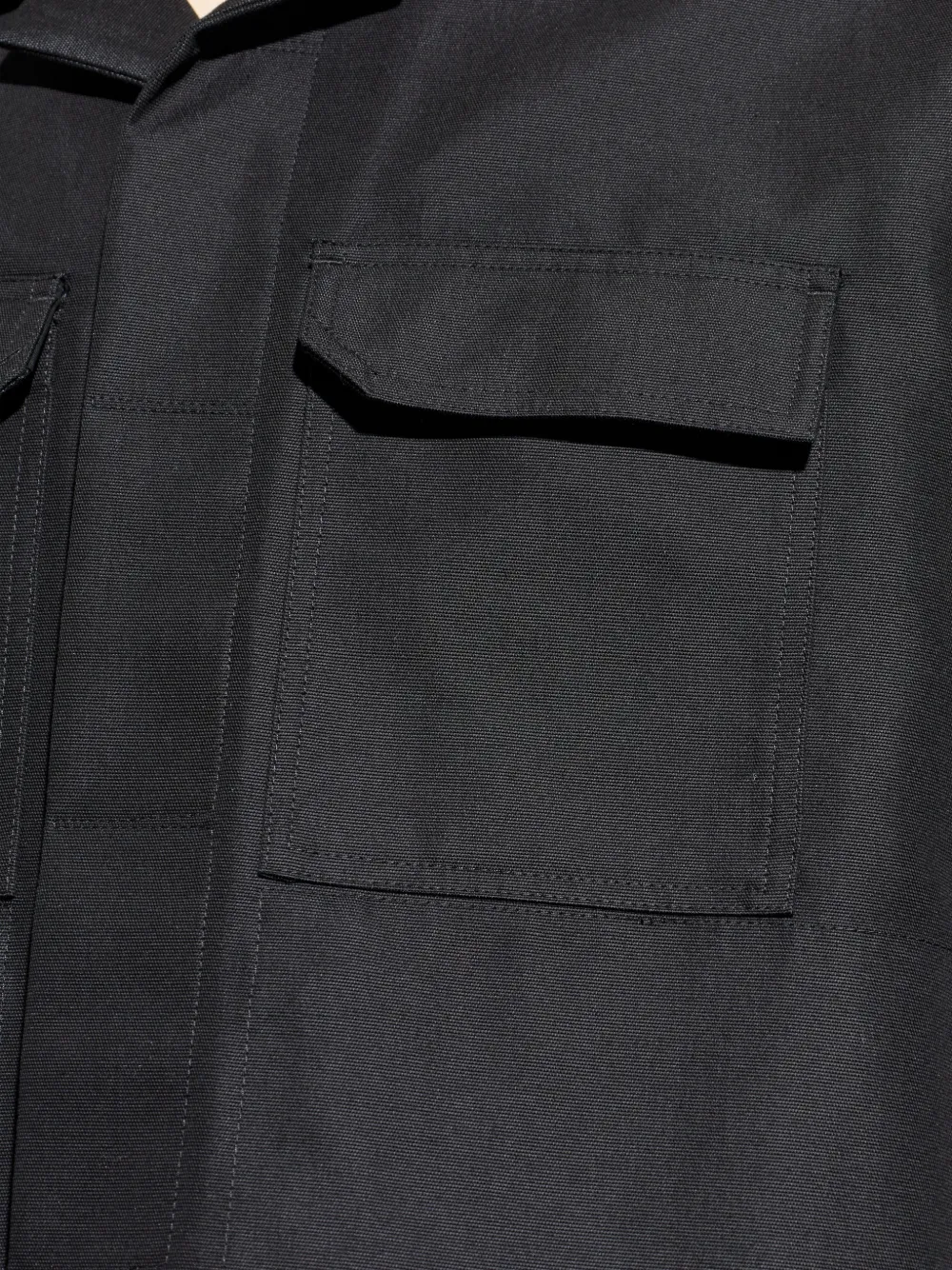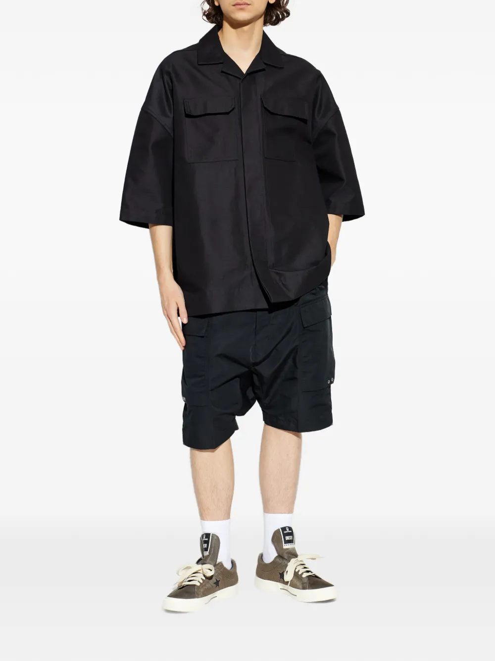 Черный цвет, два нагрудных кармана, короткие рукава, отложной воротник, прямой подол