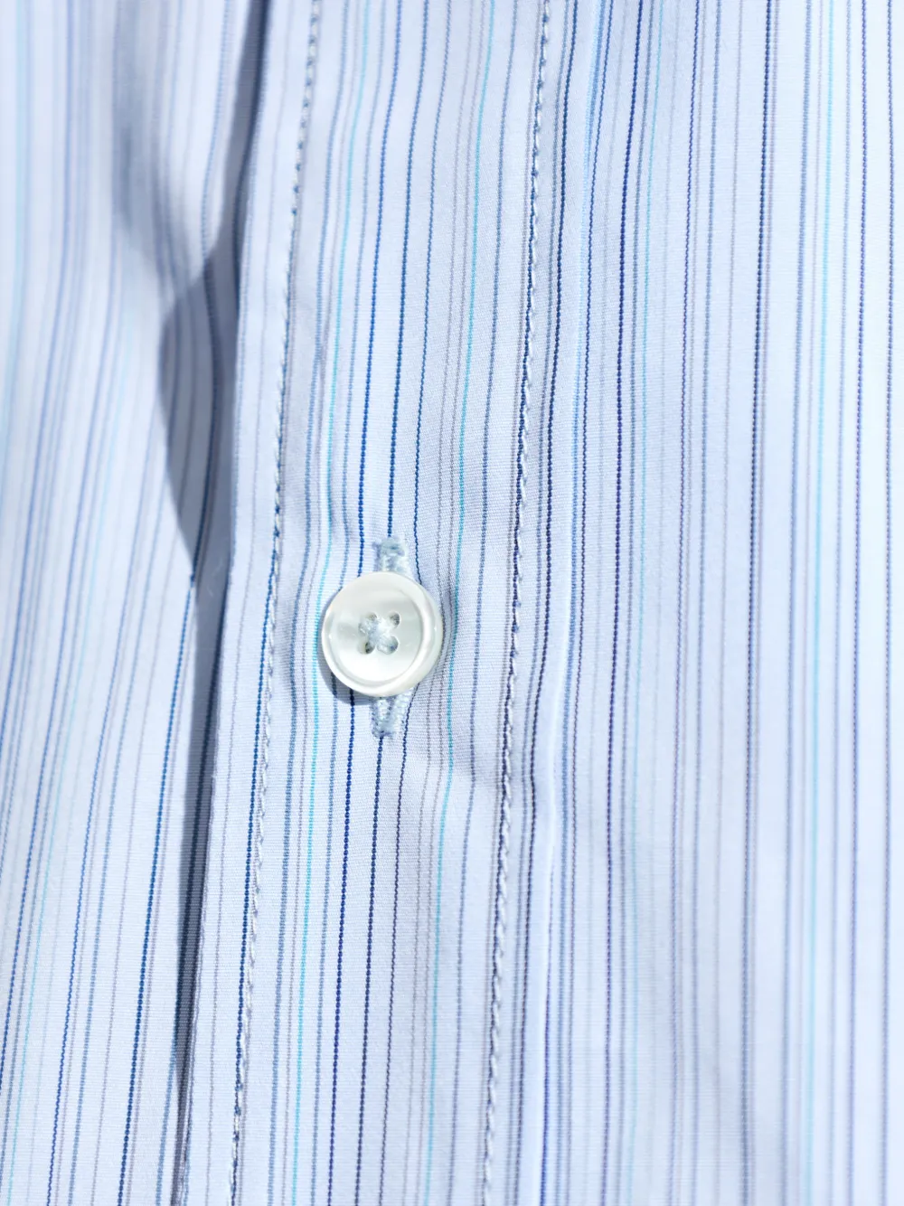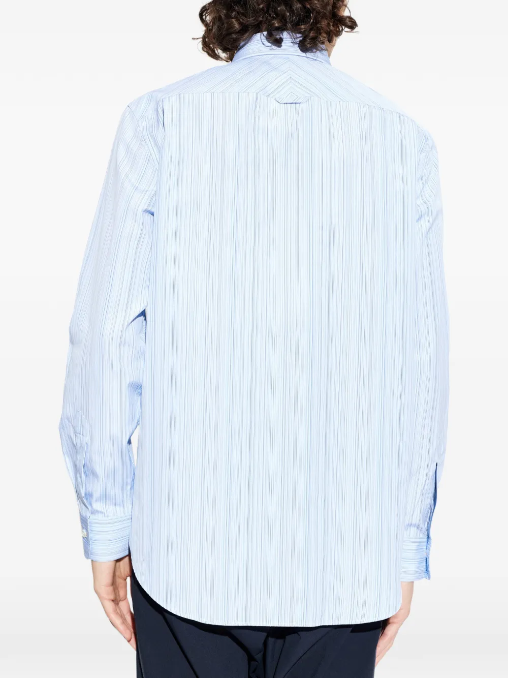 Светло-голубой с полосатым узором, застежка на пуговицы, длинные рукава, манжеты на пуговицах, классический воротник, закругленный подол