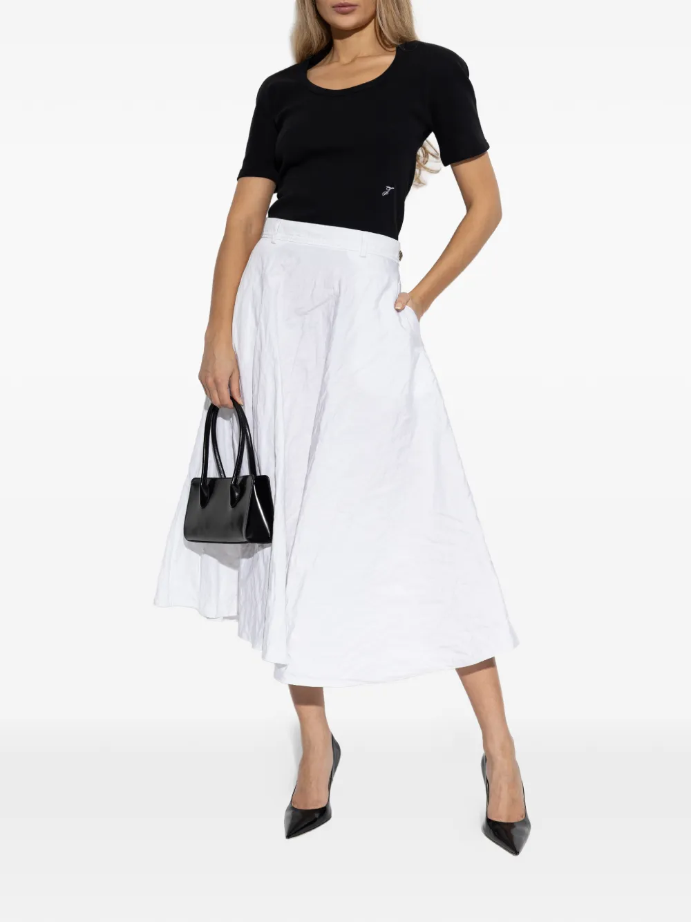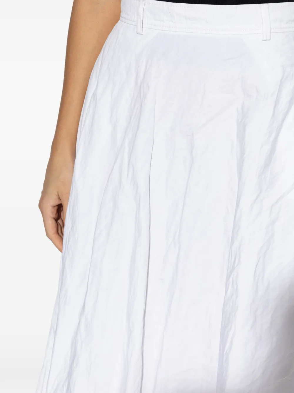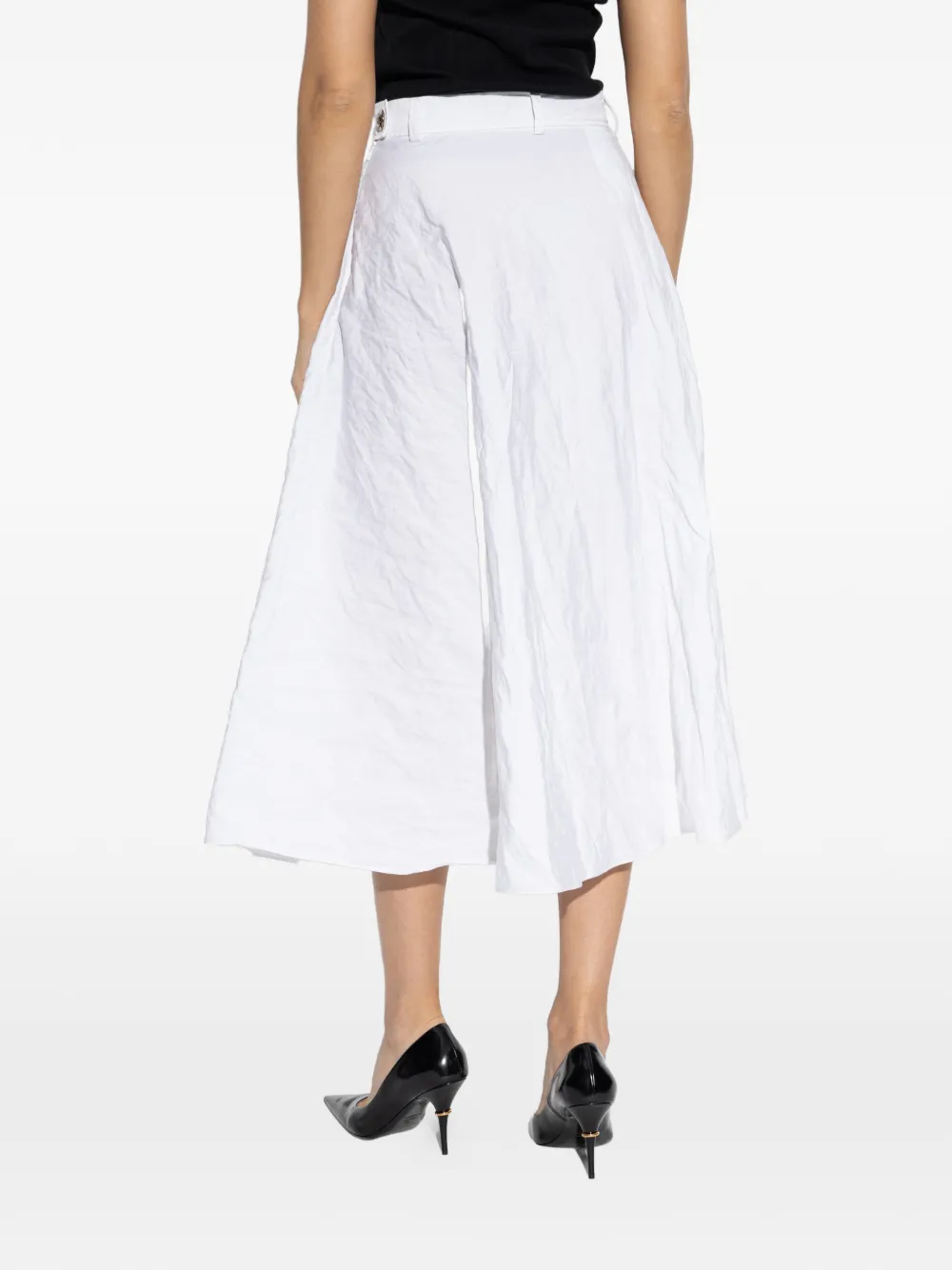 Белый с расклешенным нижним краем, пояс, эффект смятой ткани, прорезные карманы, скрытая застежка