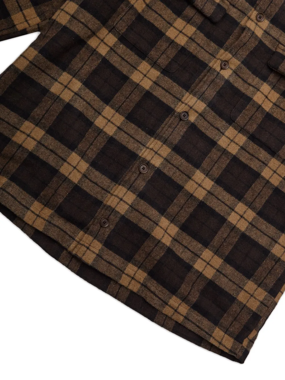 Коричневая клетчатая расцветка, накладные карманы спереди, застежка на пуговицы