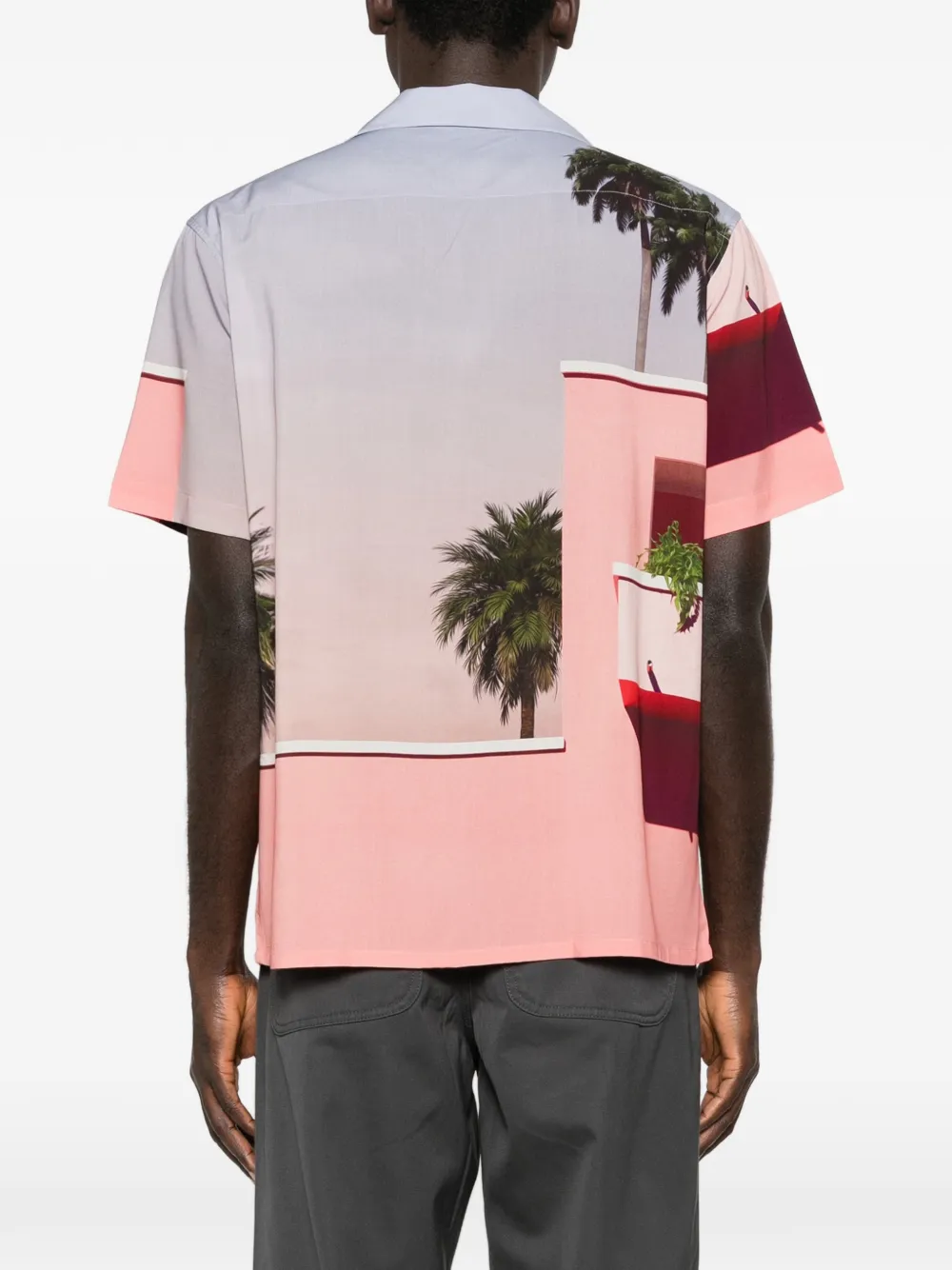 Розовая рубашка с отложным воротником, короткими рукавами, нагрудным карманом, застежкой на пуговицы и принтом
