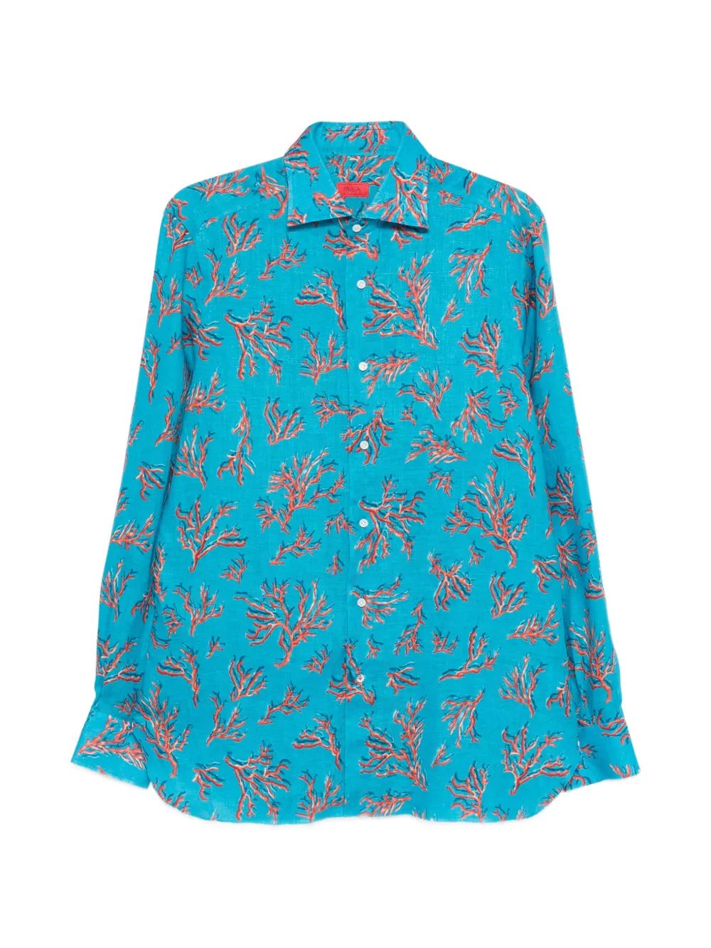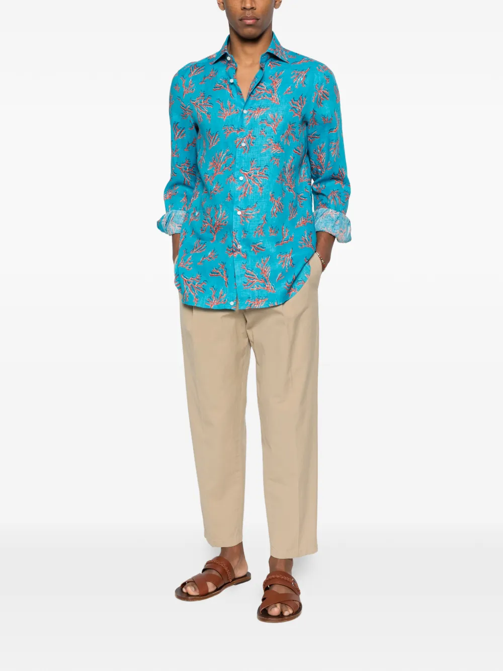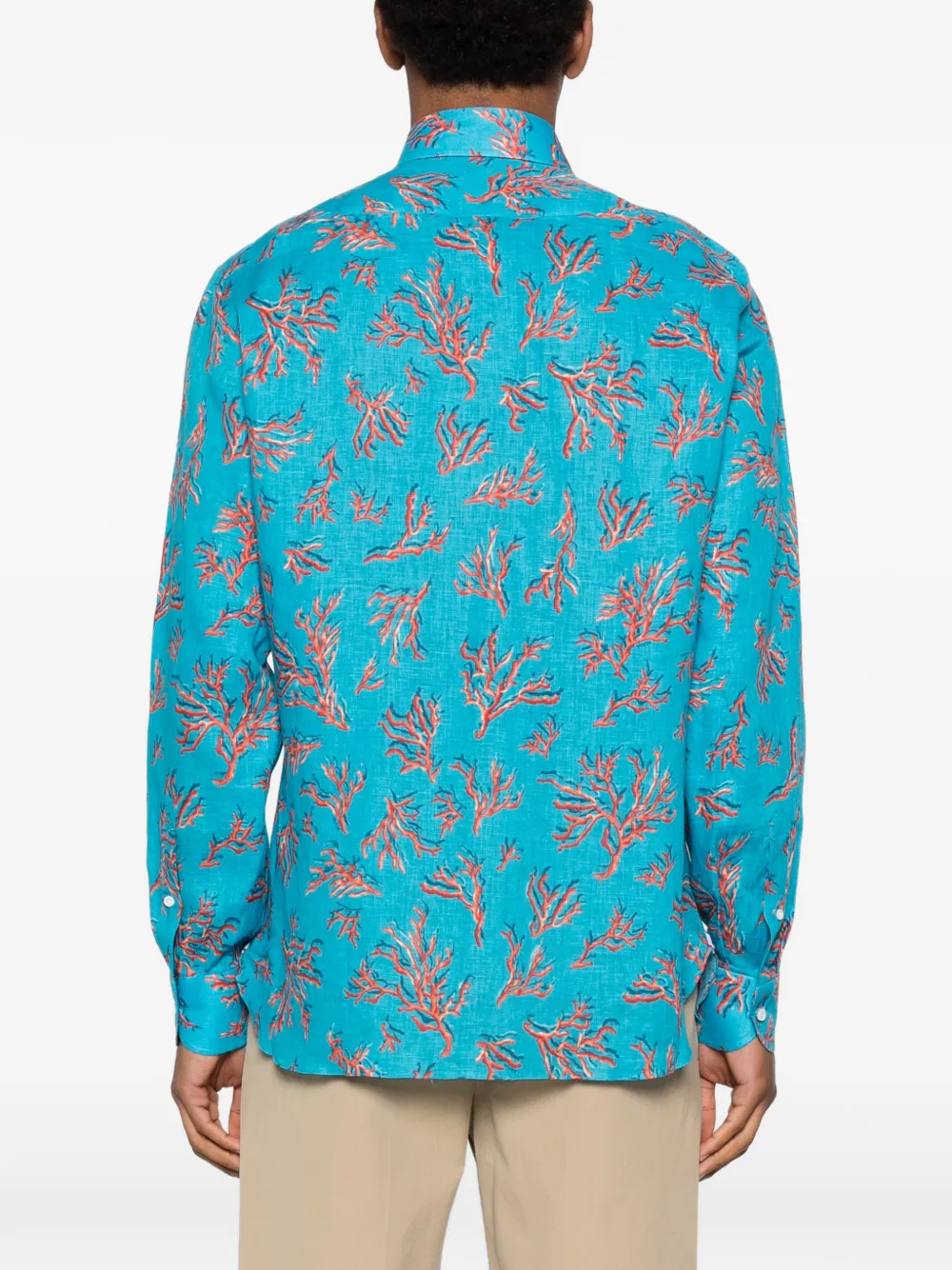 Синий с принтом по всей поверхности, застежка на пуговицы, длинные рукава, отложной воротник