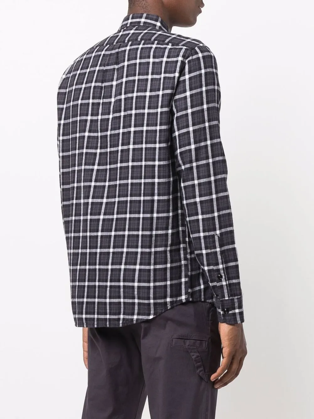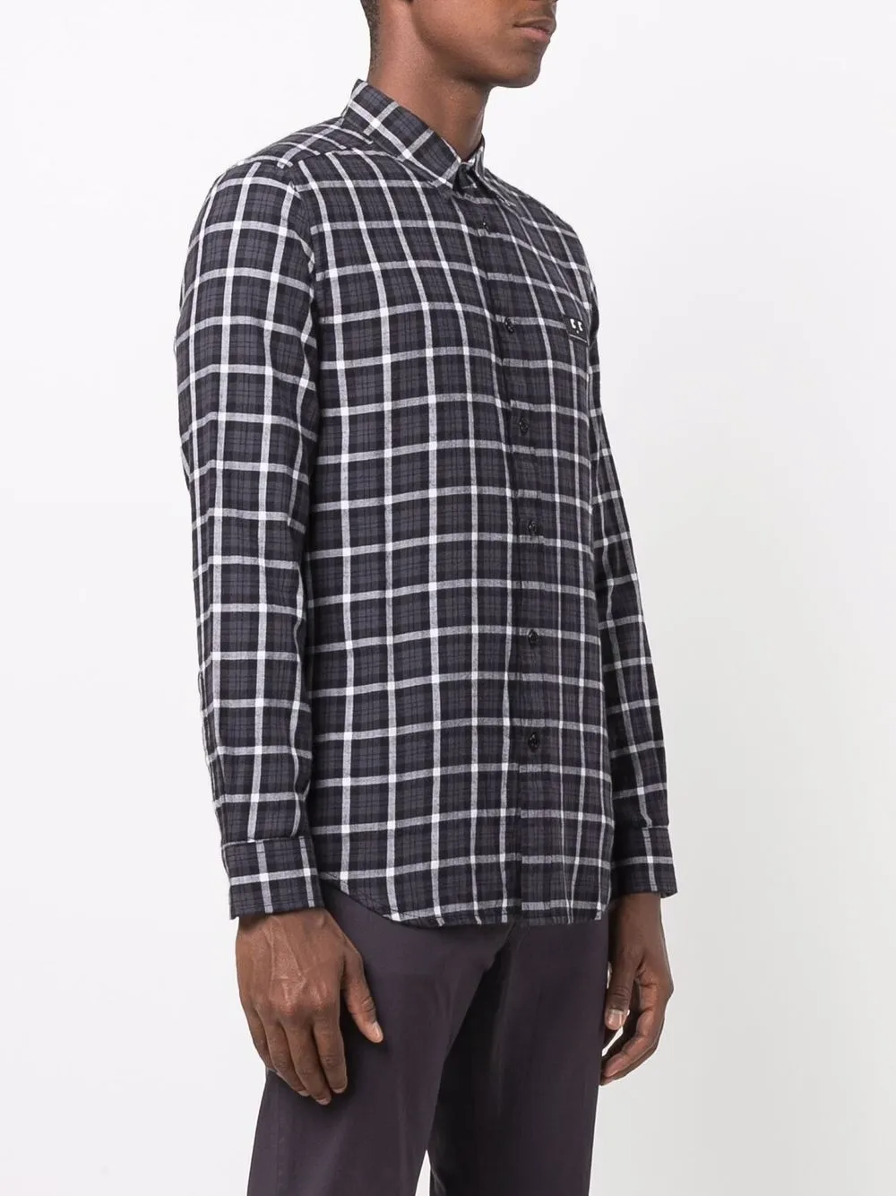 Принт в клетку, нашивка с логотипом спереди, планка на пуговицах спереди, классический воротник, длинные рукава и манжеты на пуговицах.