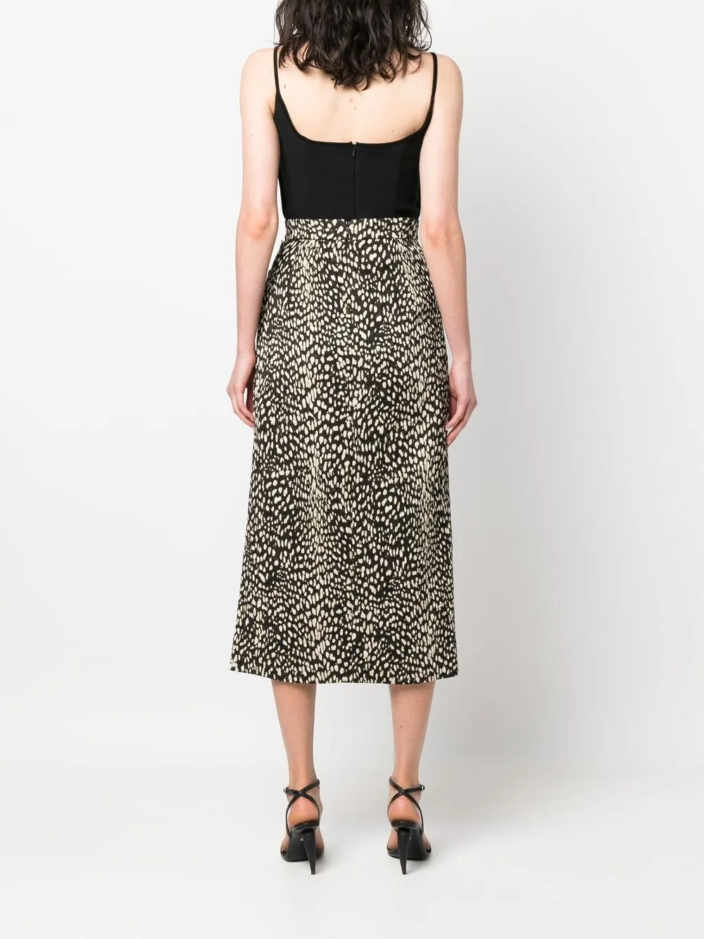 Коричневый, черный, смесовый хлопок, сплошной леопардовый принт, серебристая фурнитура, асимметричный подол и длина миди.