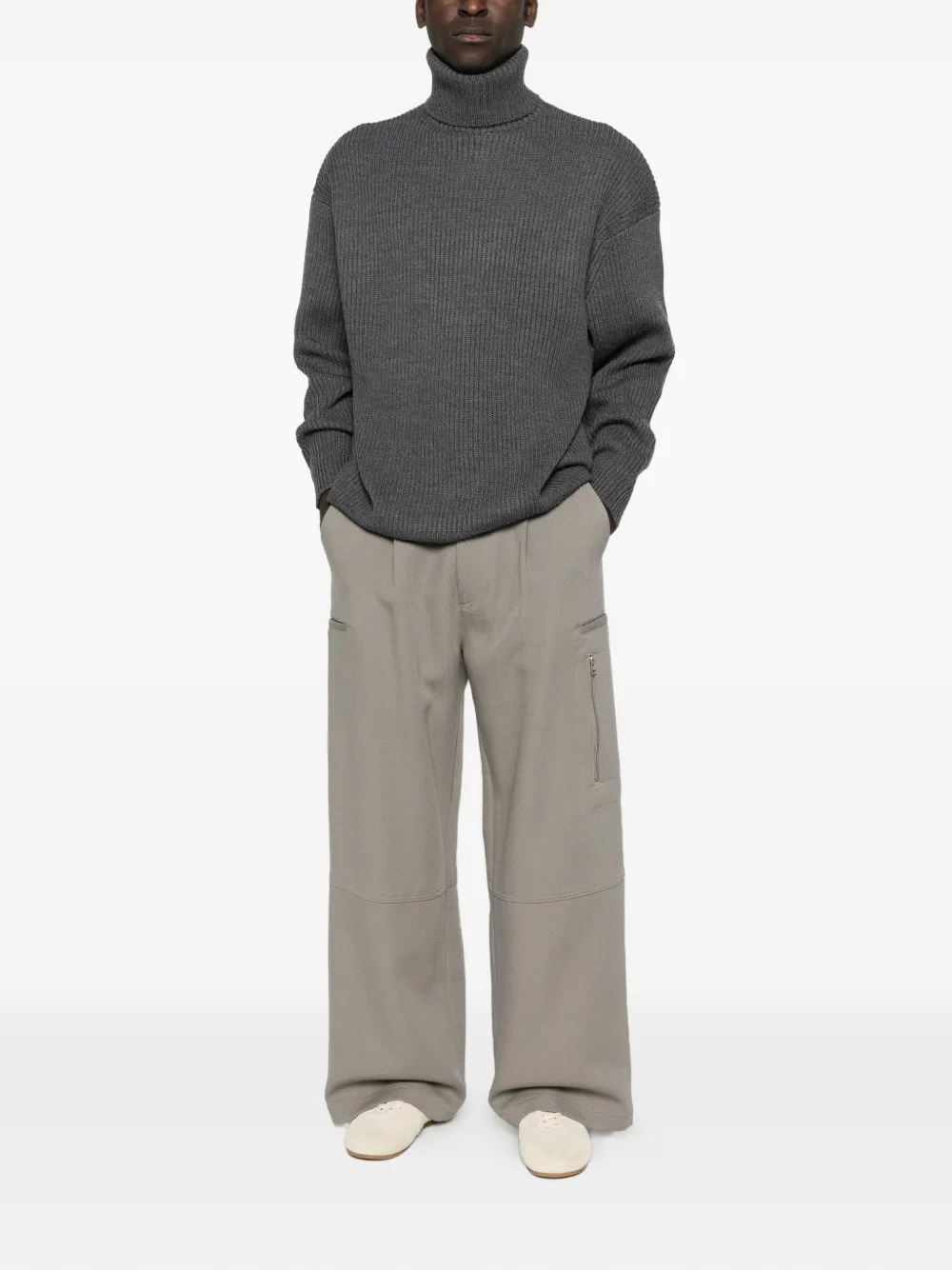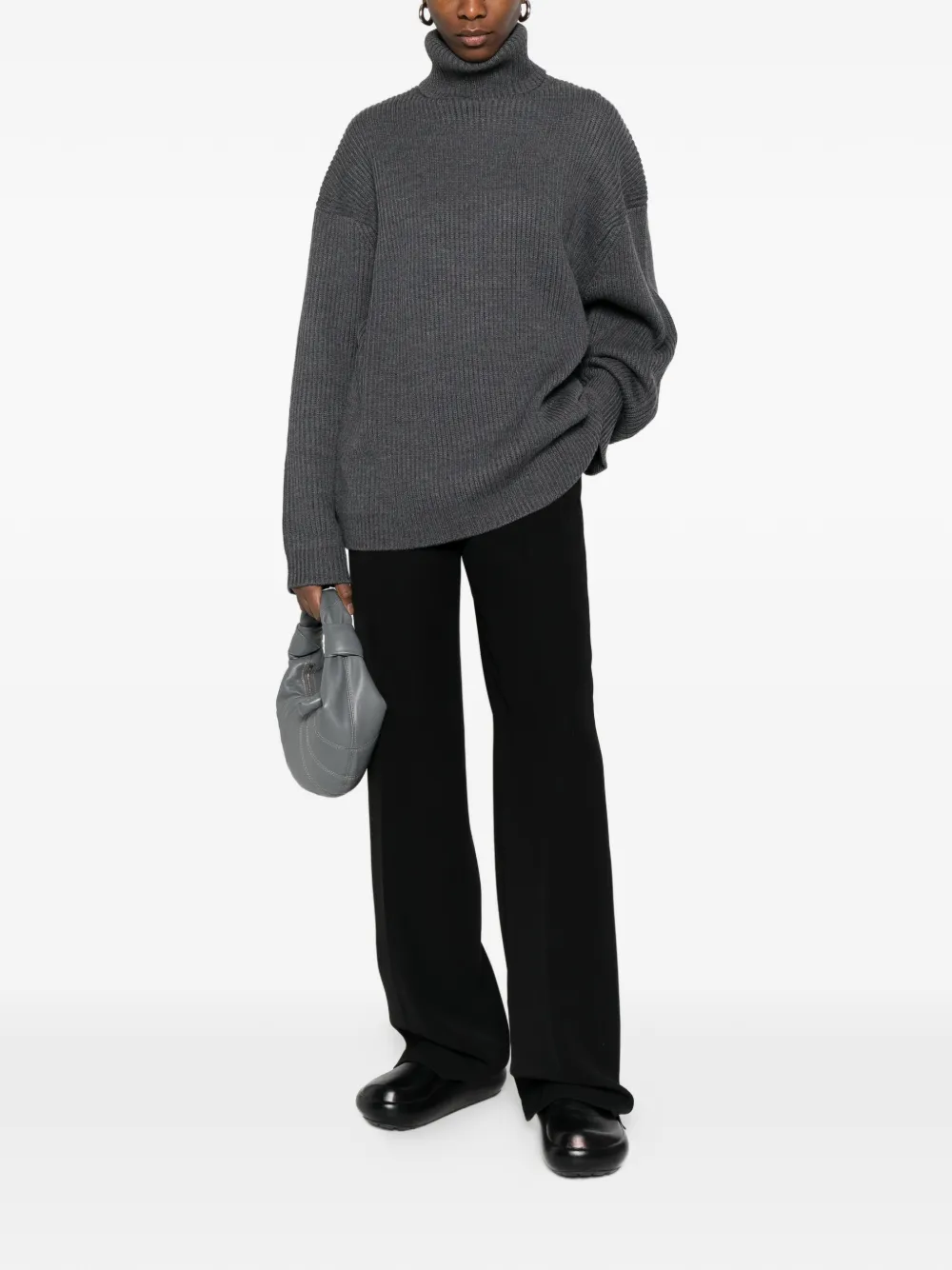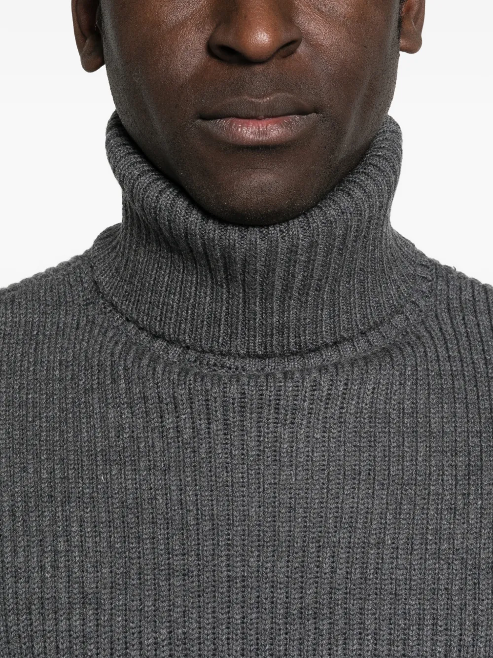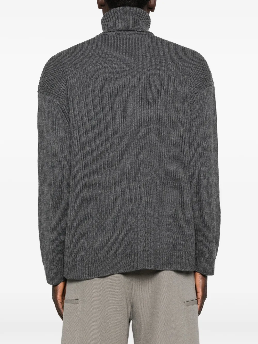 Серый вязаный свитер в рубчик с воротником-гольф, длинными рукавами и боковыми разрезами