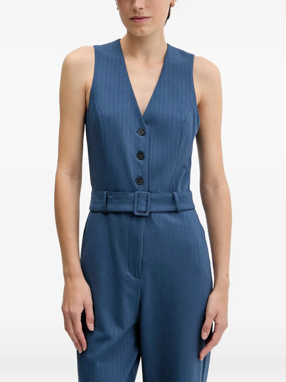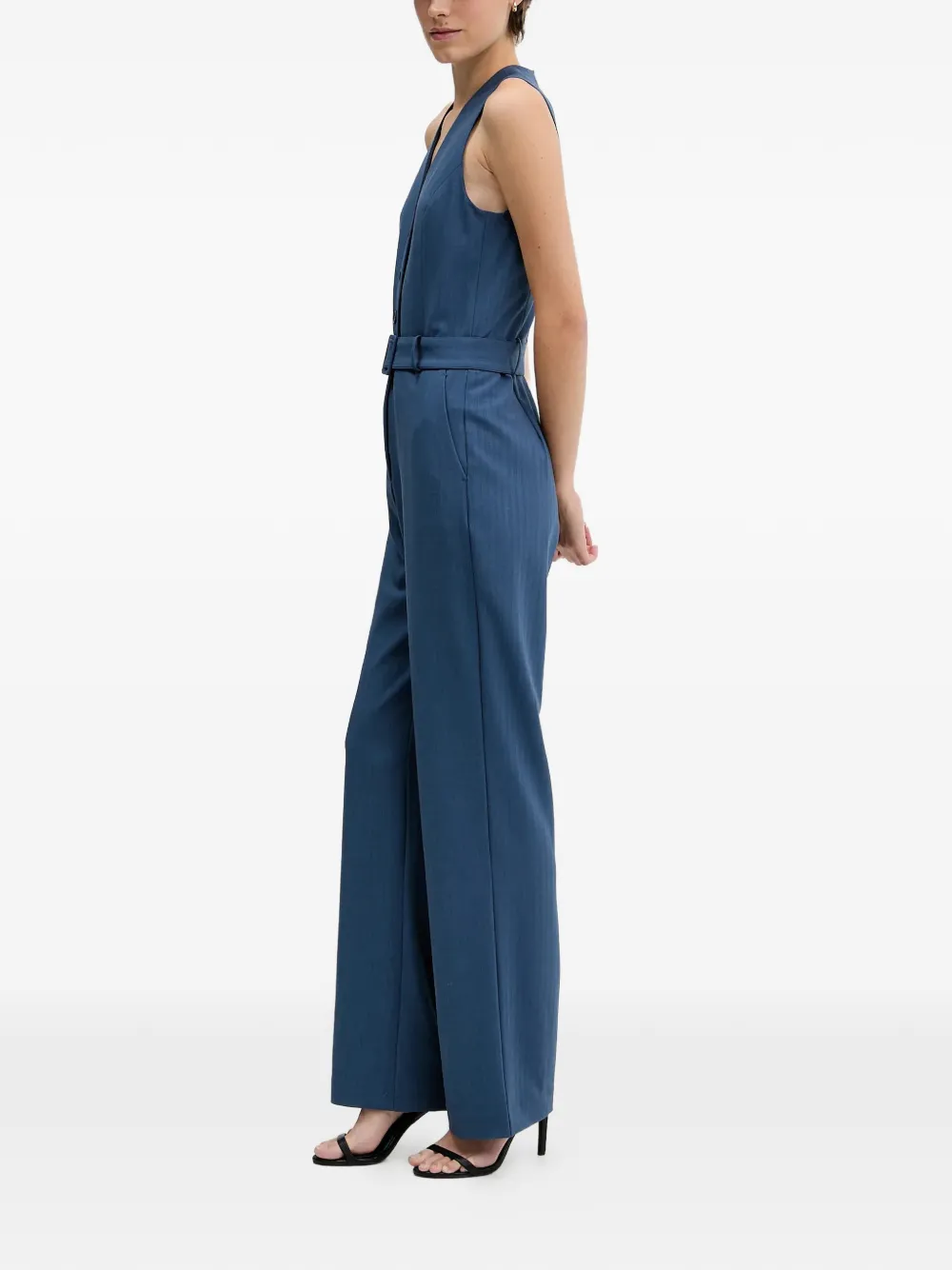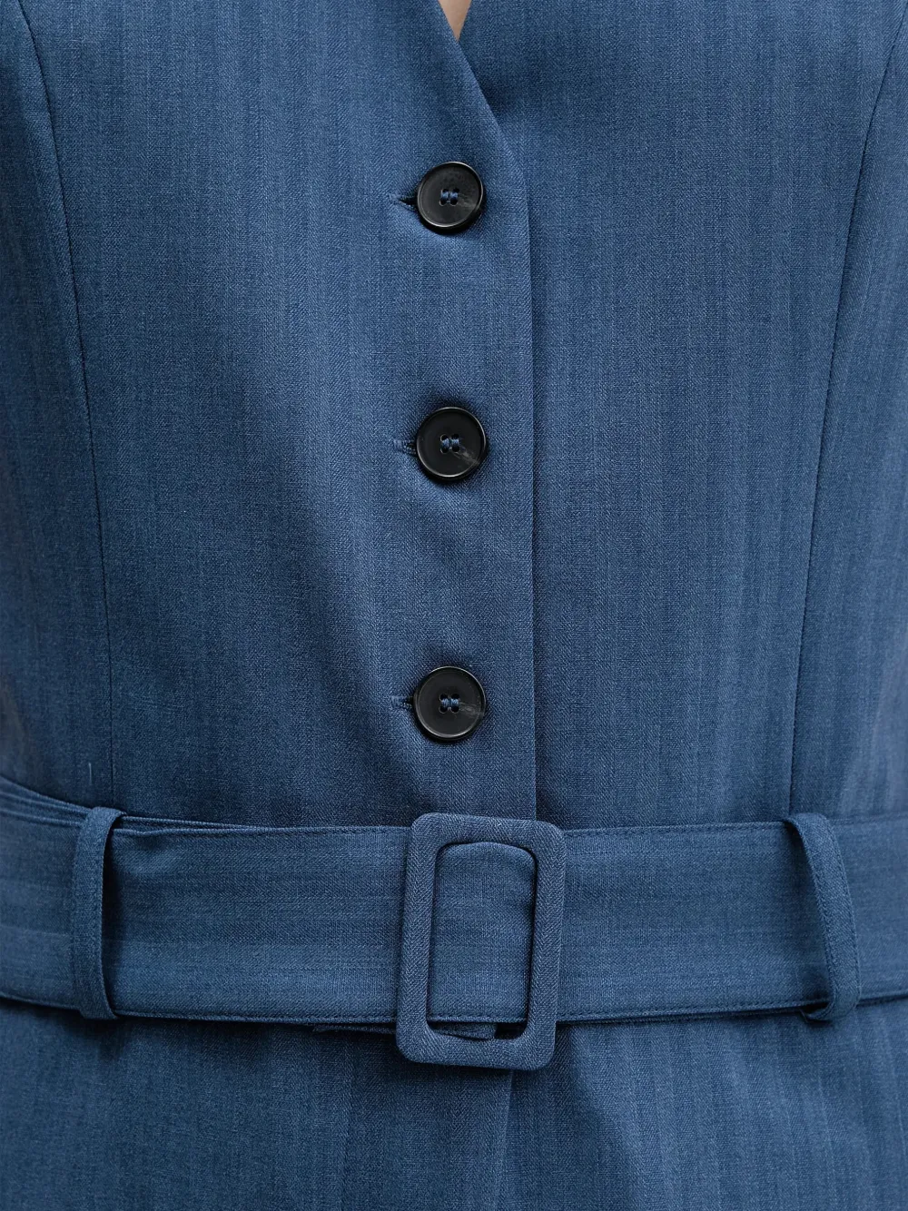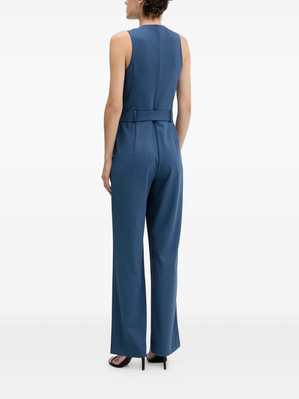 Синий комбинезон с V-образным вырезом, без рукавов, на пуговицах, с поясом на талии и широкими штанинами