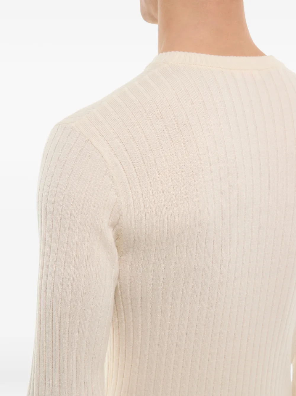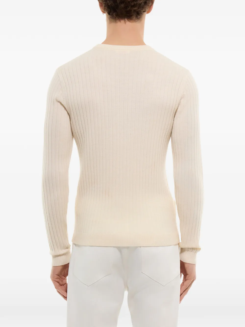 Бежевый шерстяной вязаный пуловер в рубчик с круглым вырезом и длинными рукавами