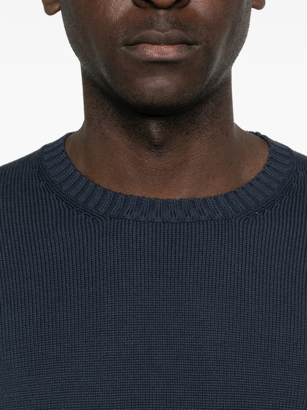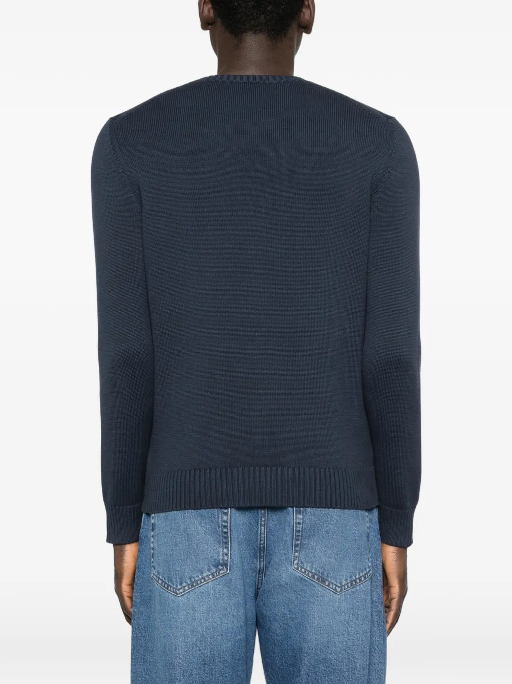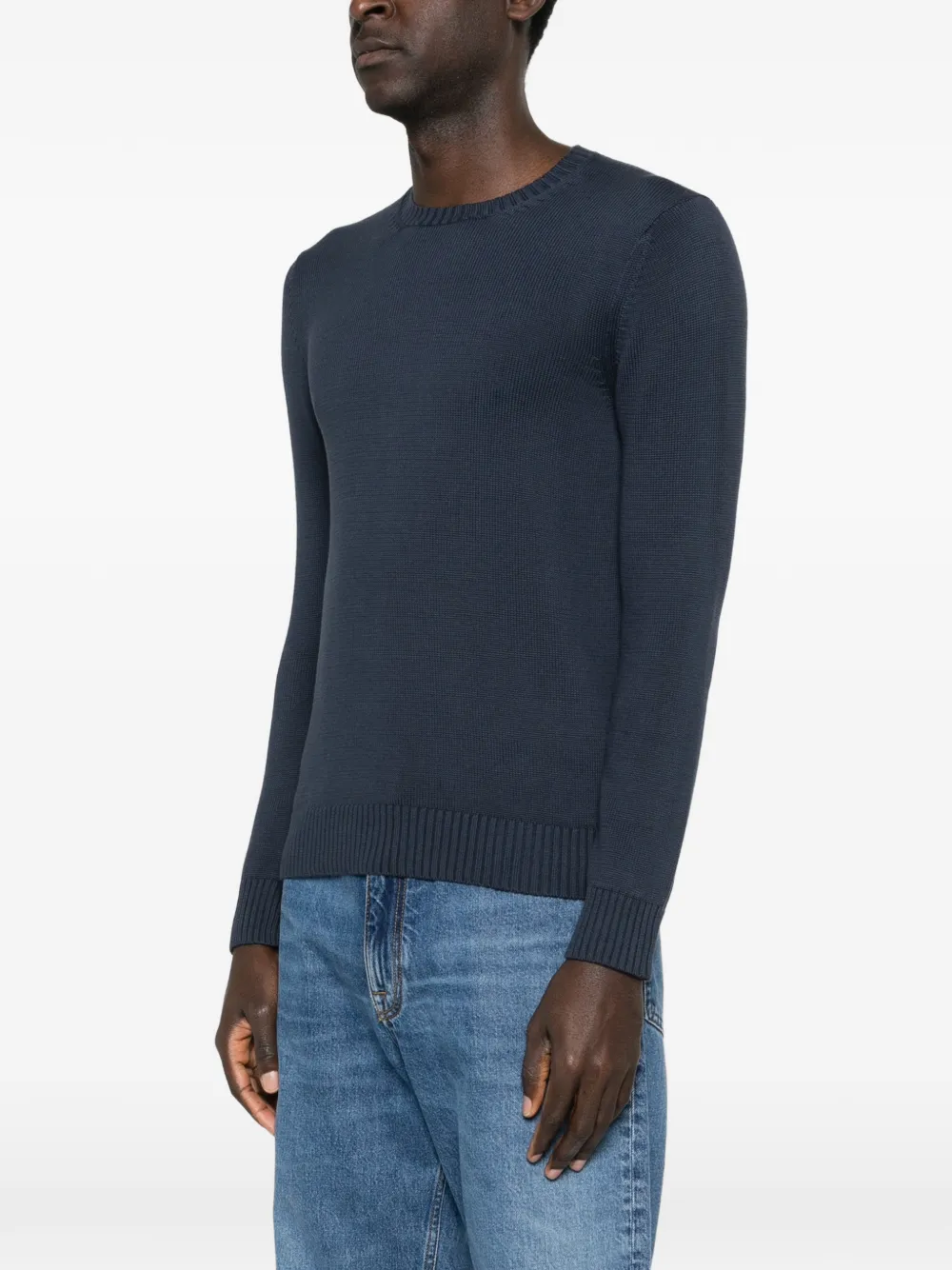 Темно-синий свитер с круглым вырезом, рубчатым подолом, рубчатыми манжетами и вязаной текстурой