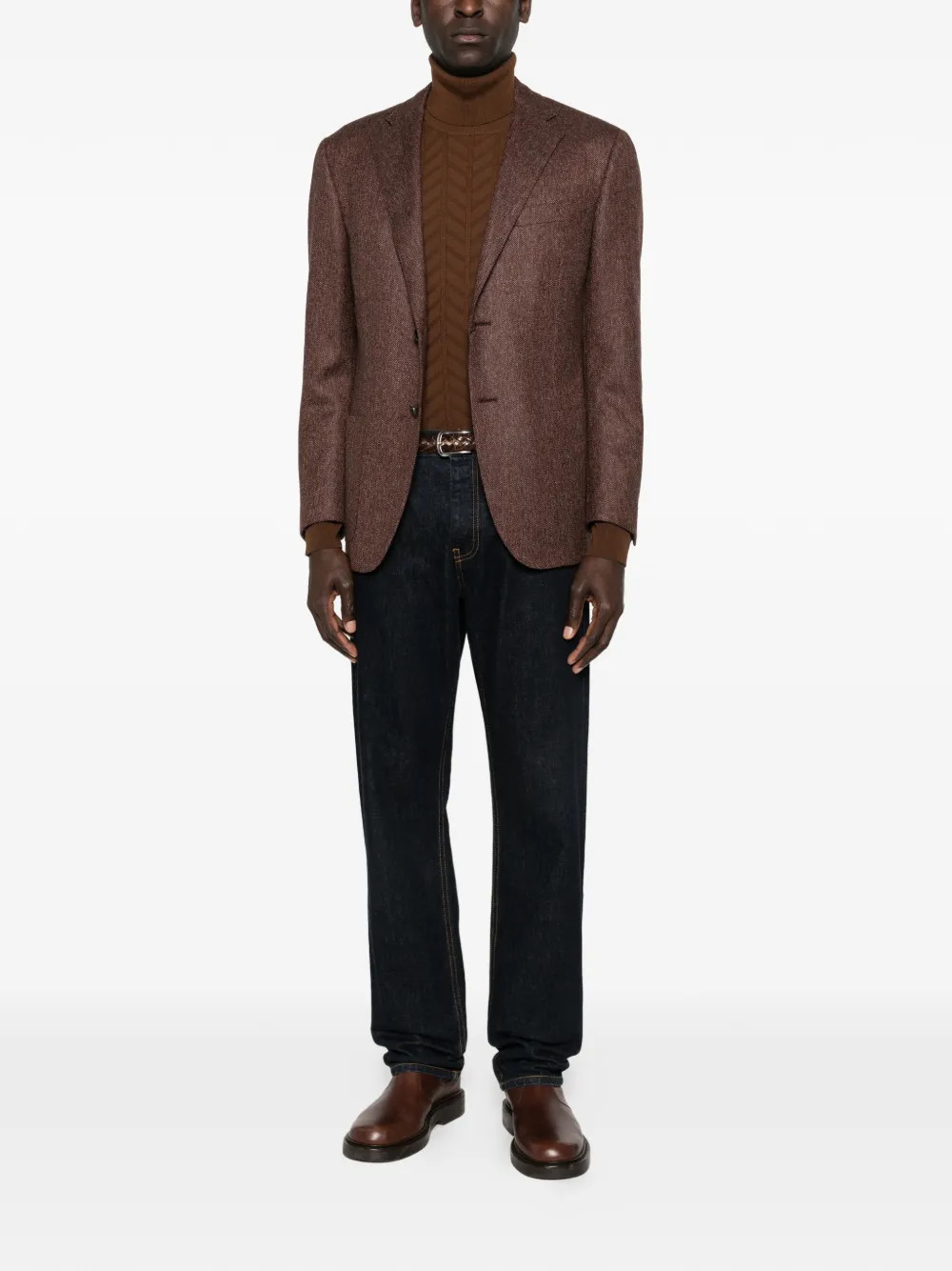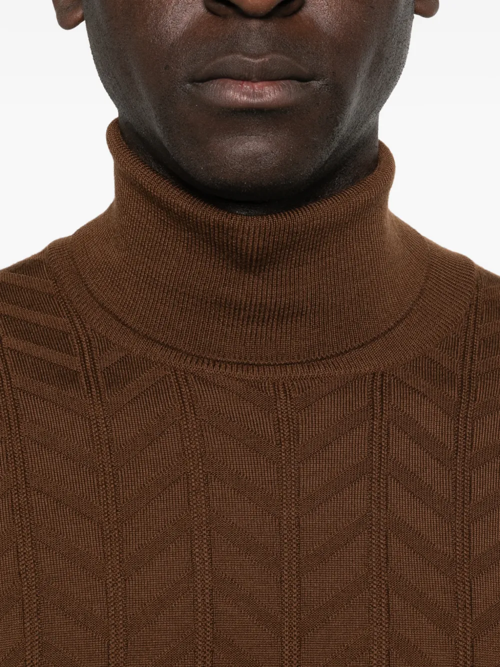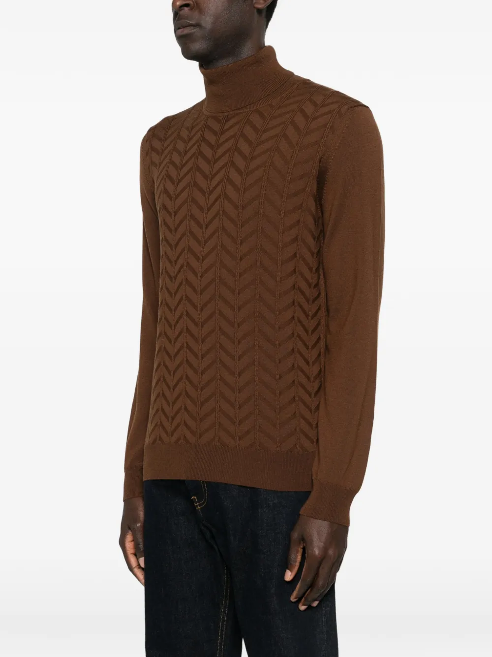 Коричневый цвет "выжженной земли", узор "елочка", воротник-гольф, длинные рукава, ребристые края