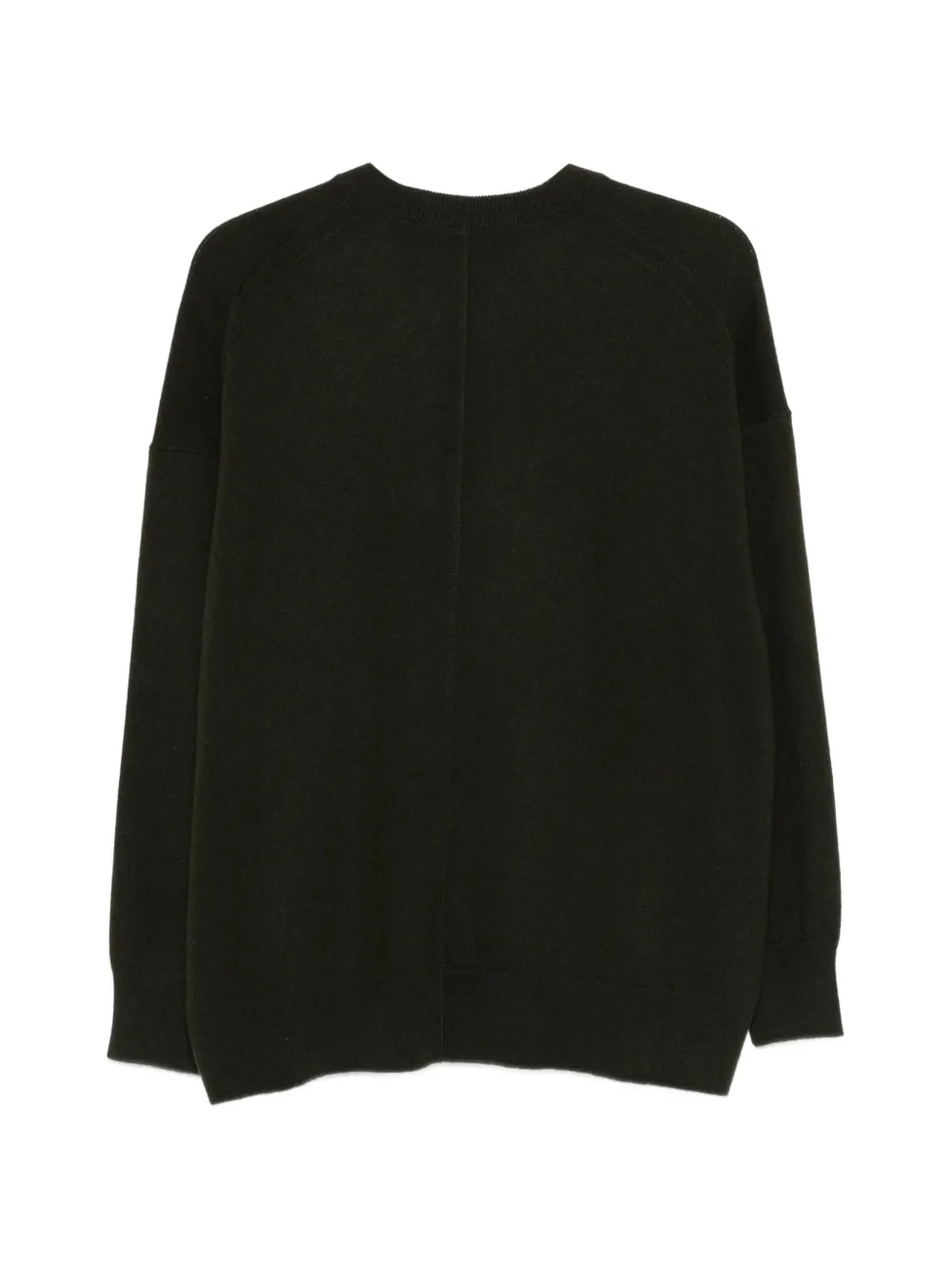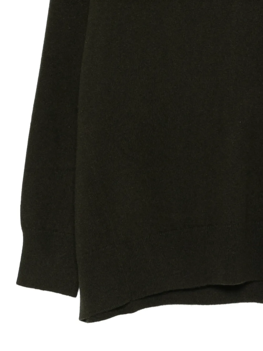 Оливково-зеленый цвет, V-образный вырез, длинные рукава, манжеты и край в рубчик