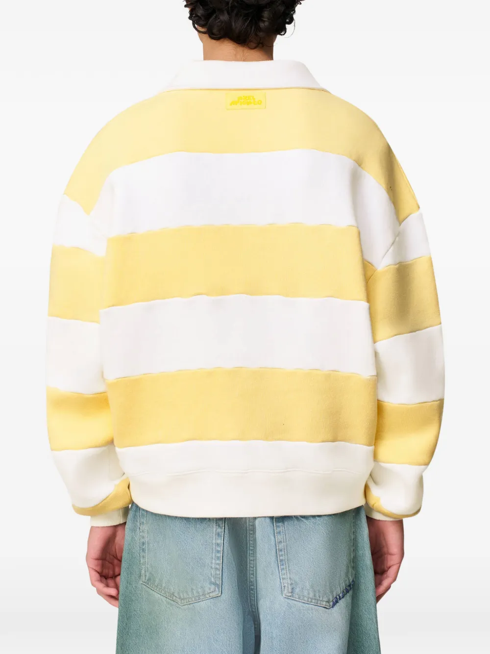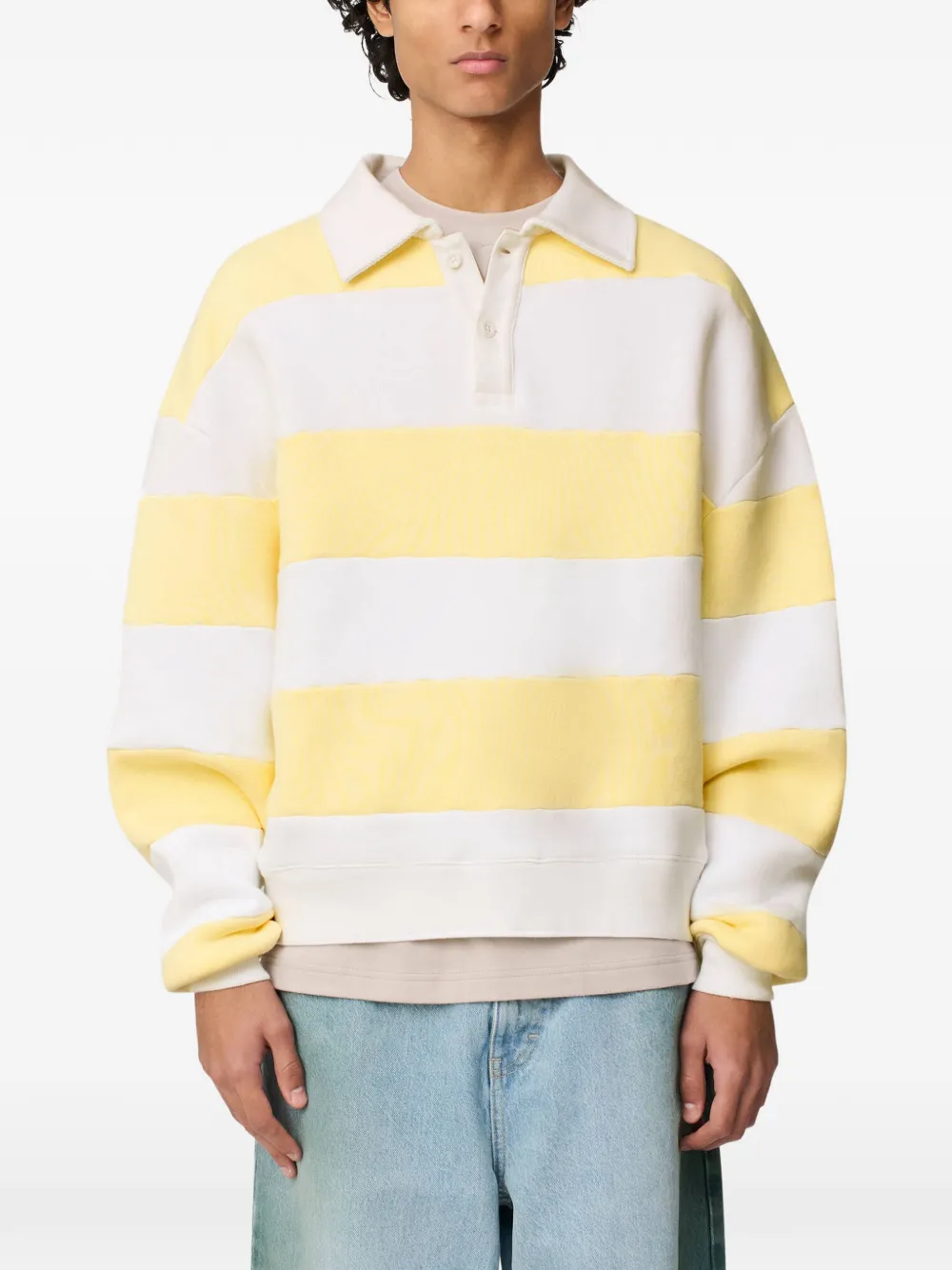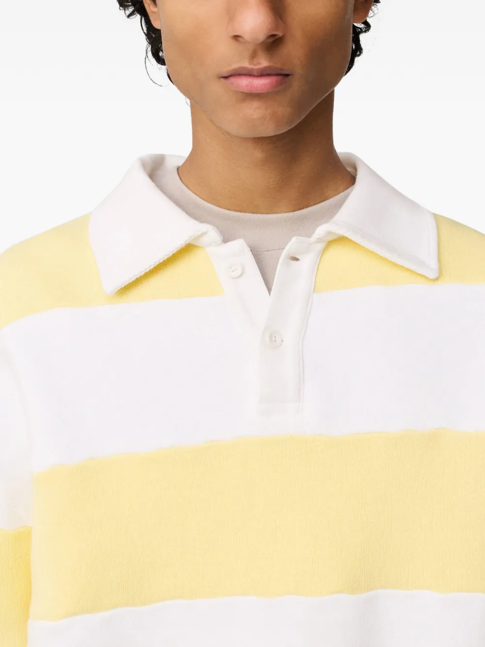 Белые/светло-желтые горизонтальные полосы, воротник с острыми концами, застежка на пуговицы спереди, длинные рукава, нашивка с логотипом сзади