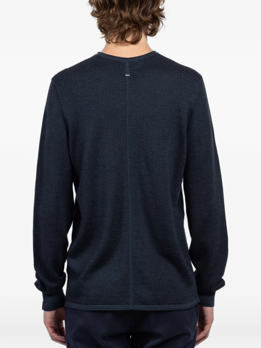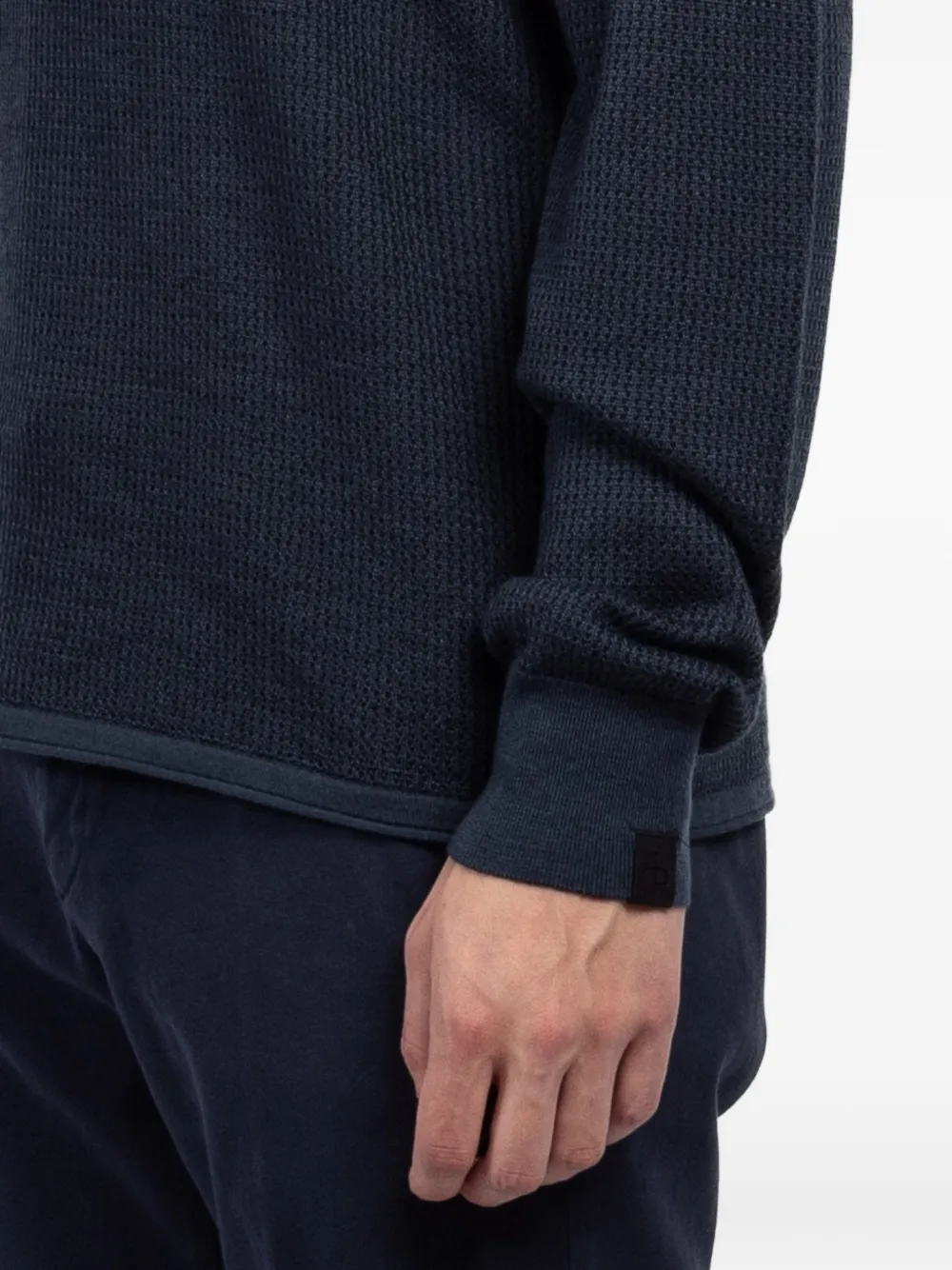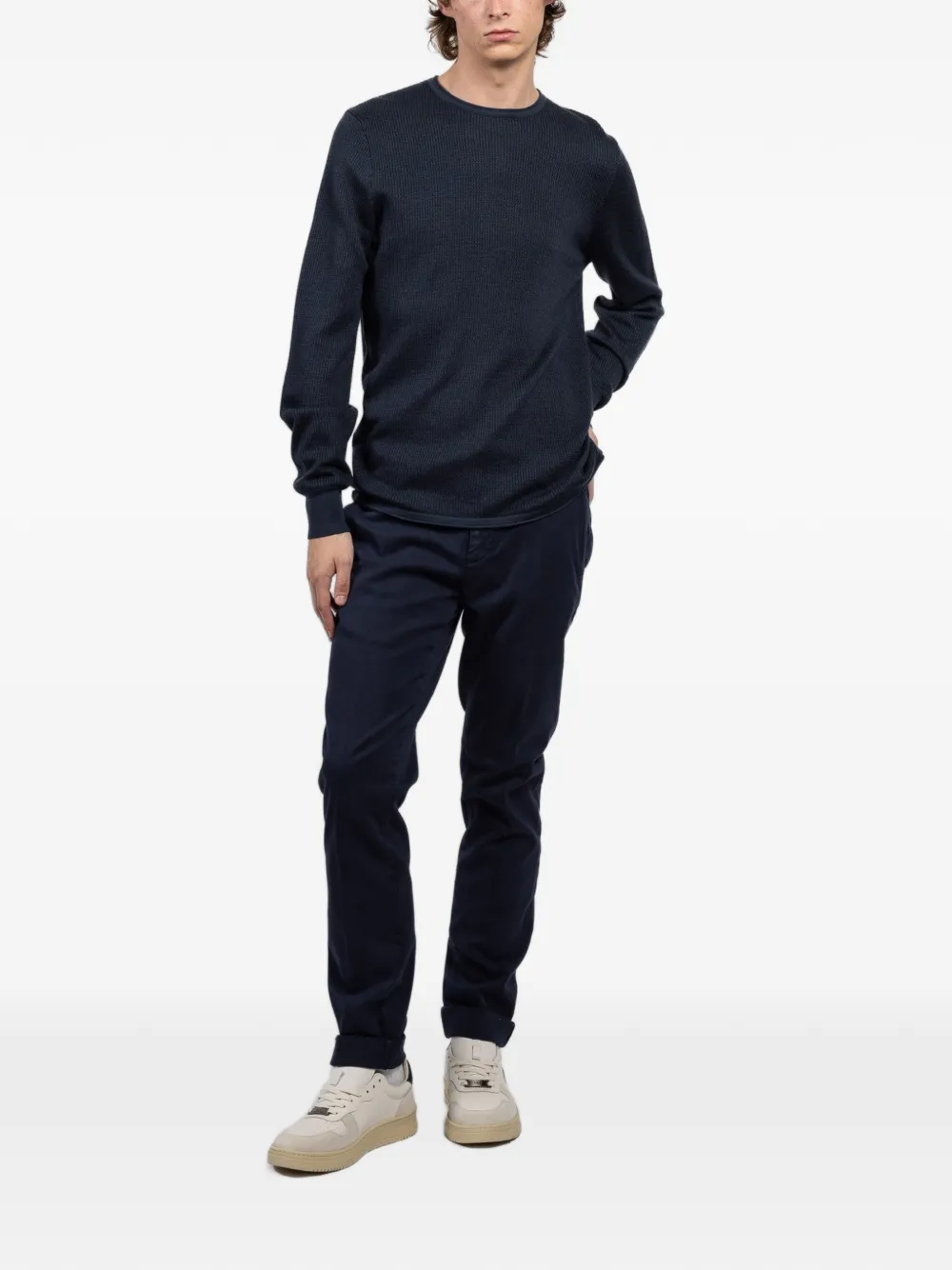 Темно-синий джемпер вафельной вязки с круглым вырезом, длинными рукавами, ребристыми манжетами и прямым подолом