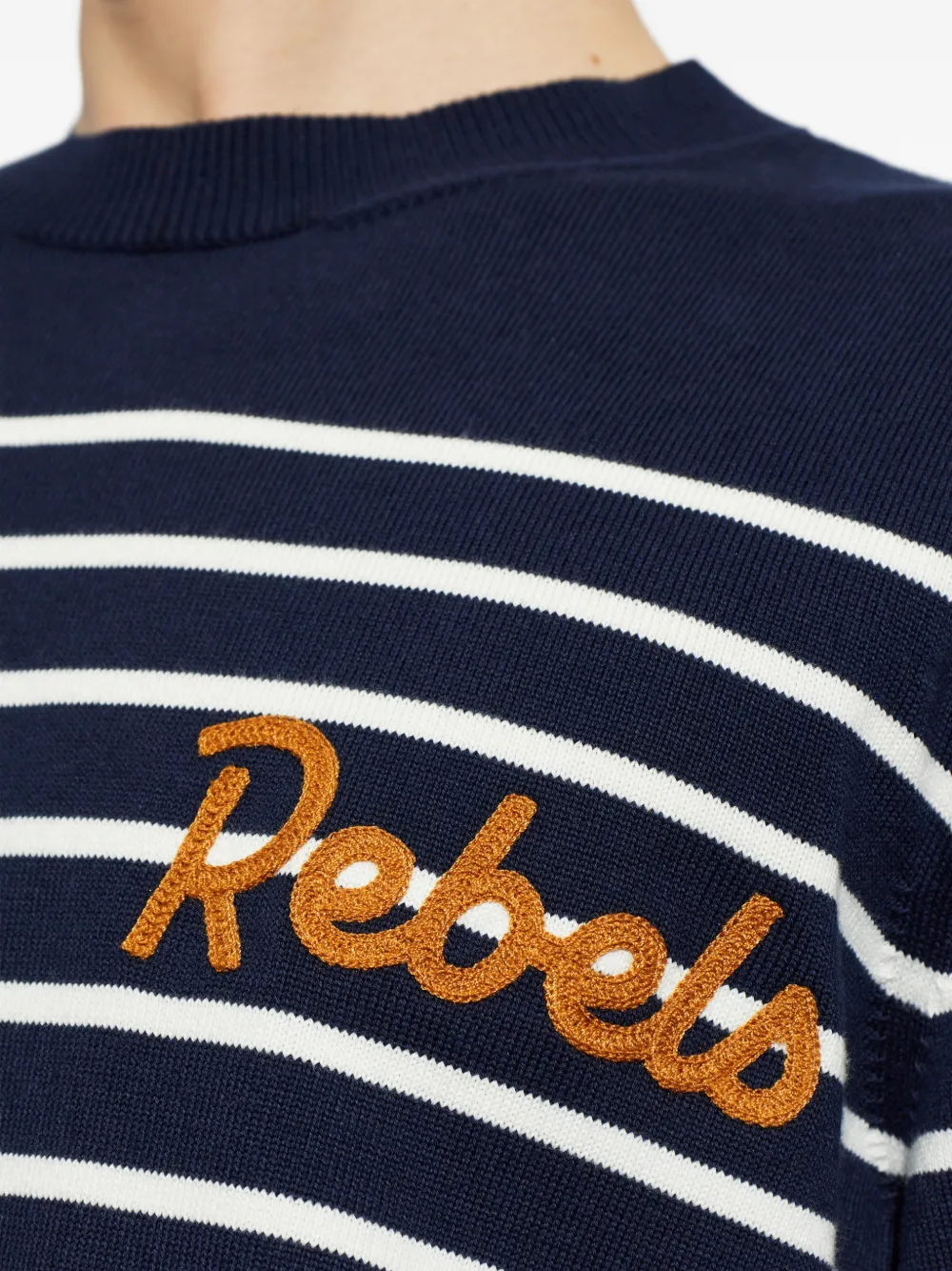 Темно-синий с полосатым дизайном, круглый вырез, вышитая надпись, длинные рукава, ребристый низ