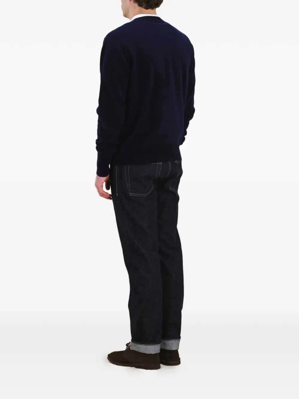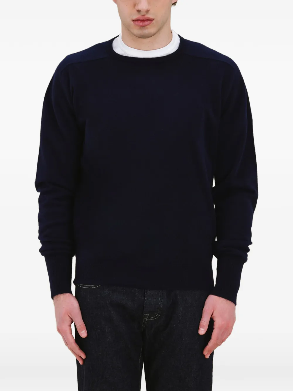 Темно-синий джемпер с круглым вырезом, рукавами-реглан, трикотажной резинкой на манжетах и по нижнему краю, из кашемира