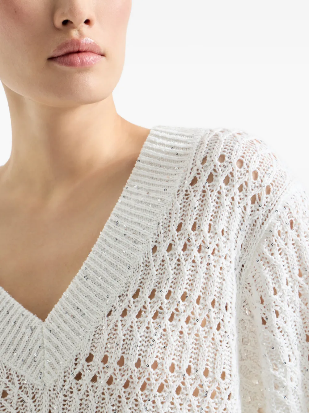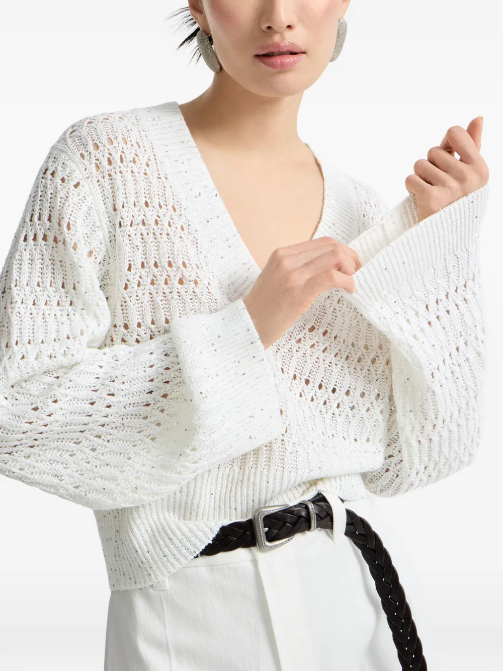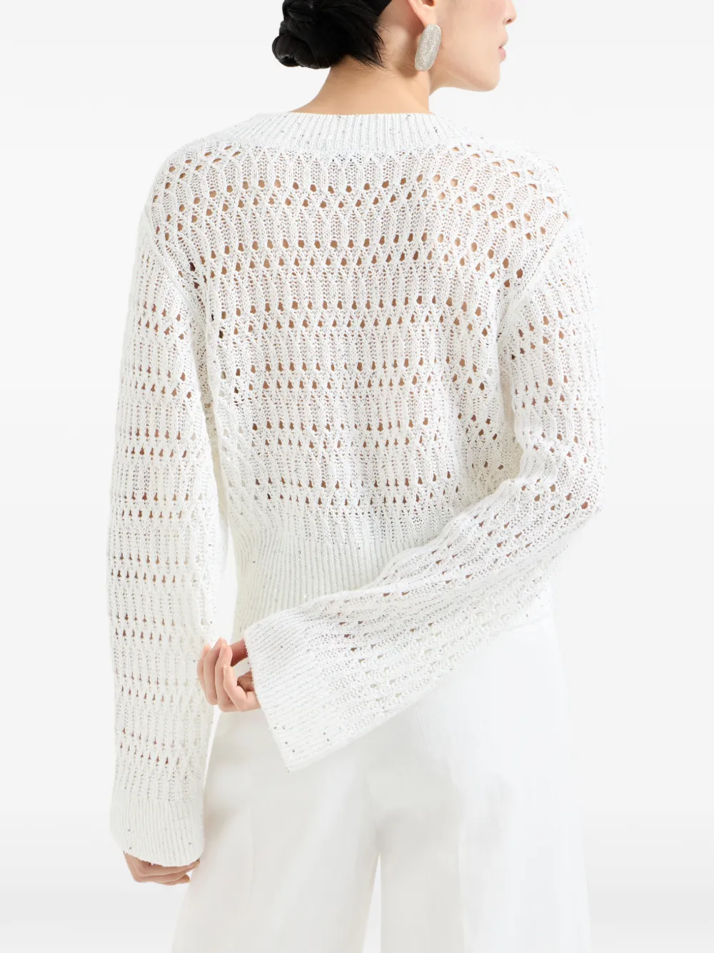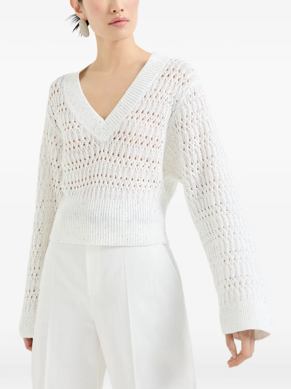 Белый открытый вязаный джемпер с V-образным вырезом, украшенный пайетками, с длинными рукавами