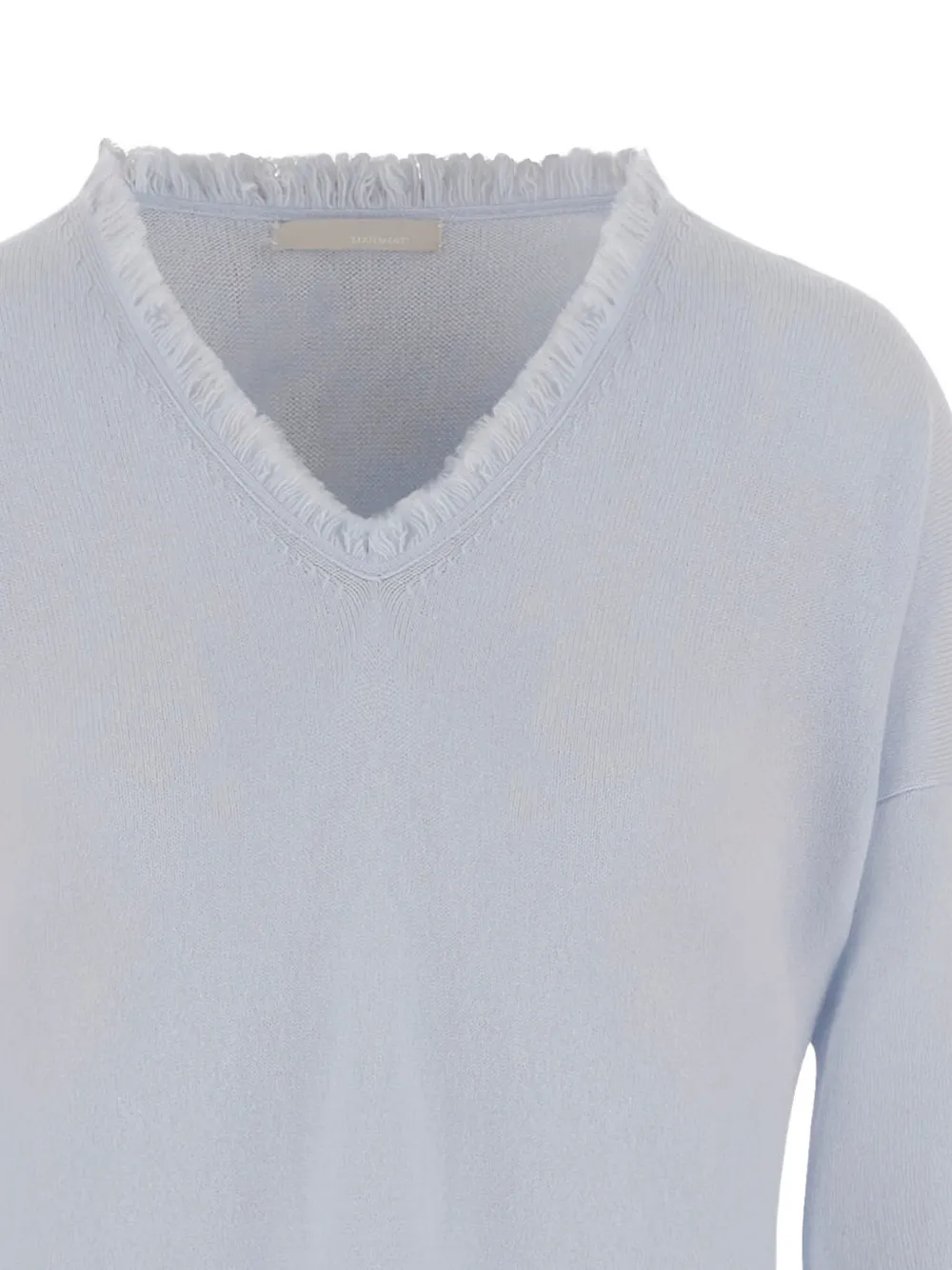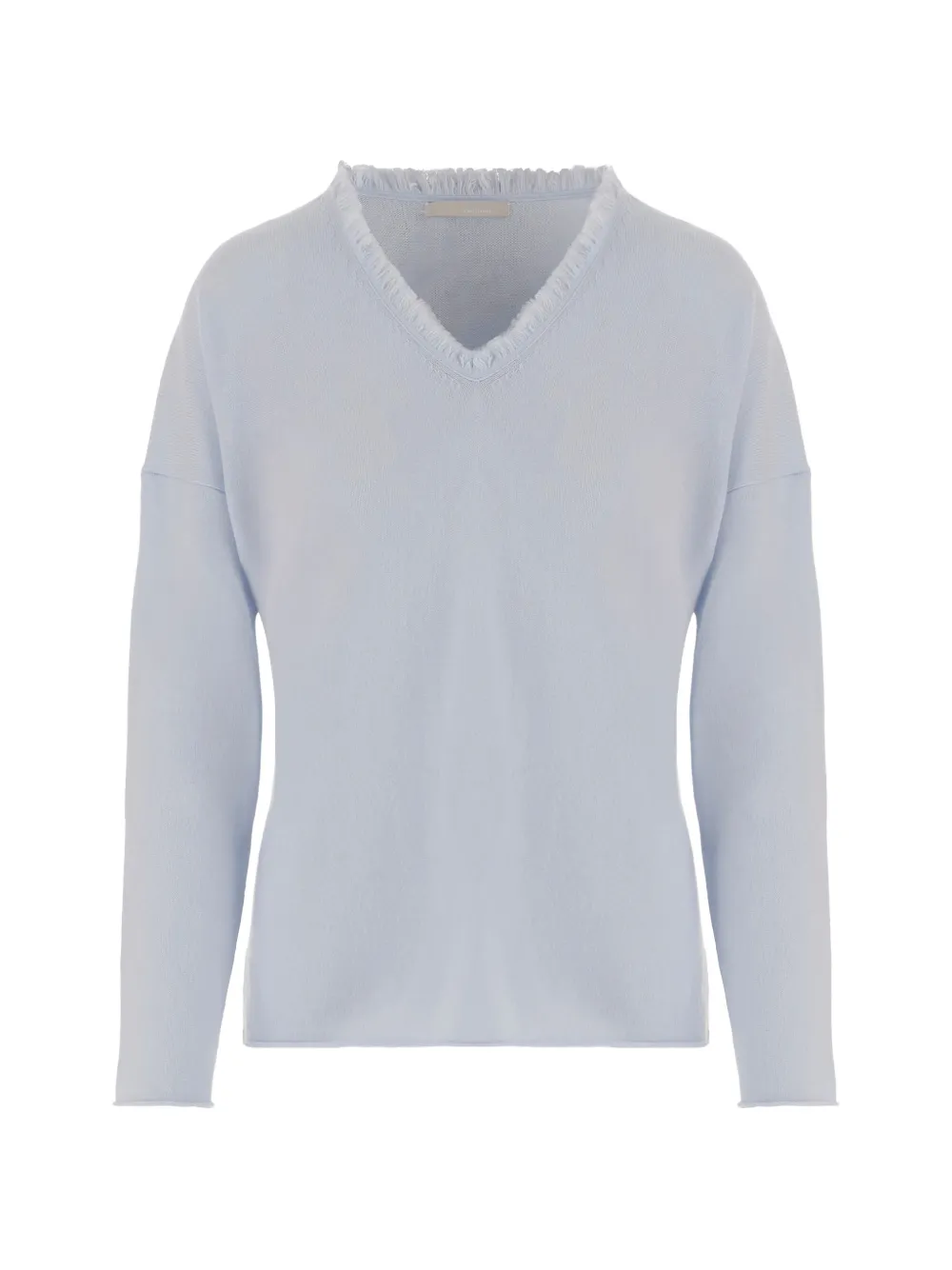 Светло-голубой V-образный вырез, отделка бахромой, длинные рукава, прямой низ