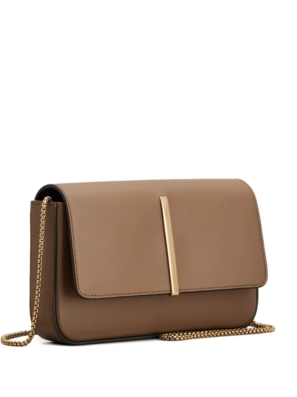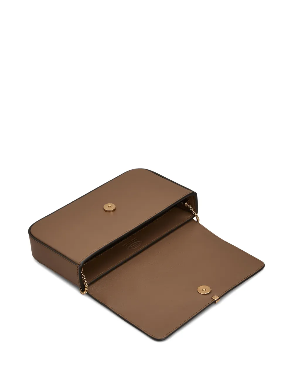Коричневый клатч с логотипом, плечевой ремешок-цепочка, откидной клапан на магнитной застежке, основное отделение, фурнитура цвета золота