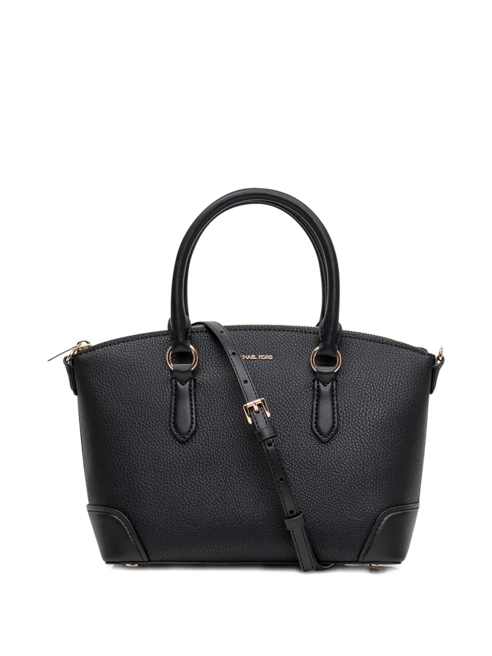 Черная зернистая текстура, верхние ручки, фурнитура золотистого цвета, съемный плечевой ремень, застежка на молнии