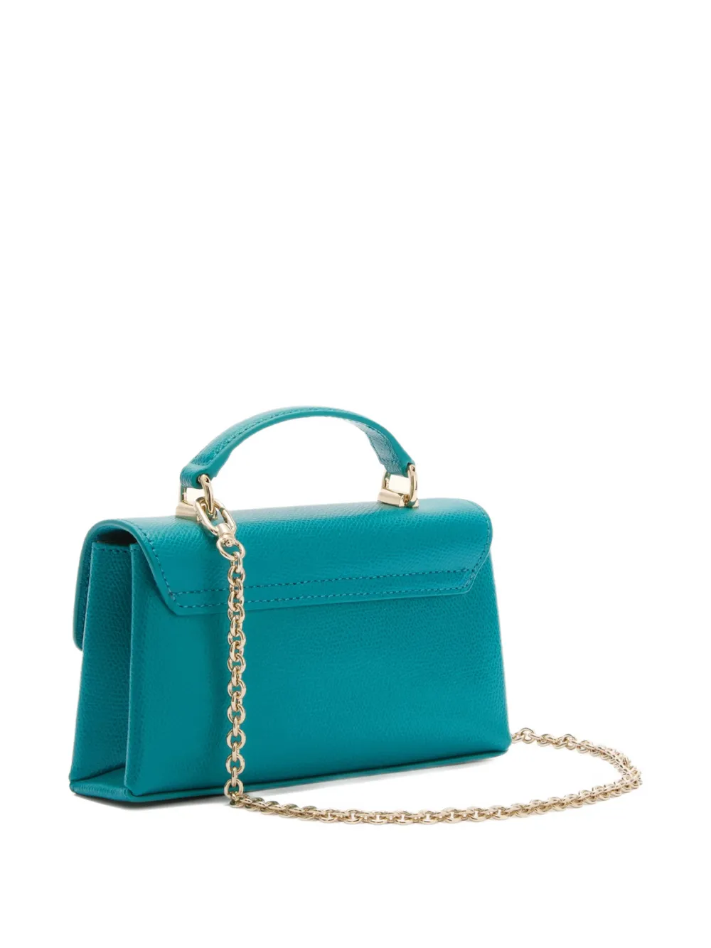 Бирюзовая фактурная сумка с короткой ручкой, съемным цепочным ремнем, застежкой-поворотом и логотипом-дугой