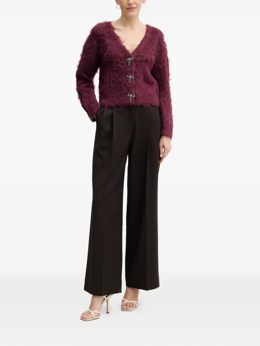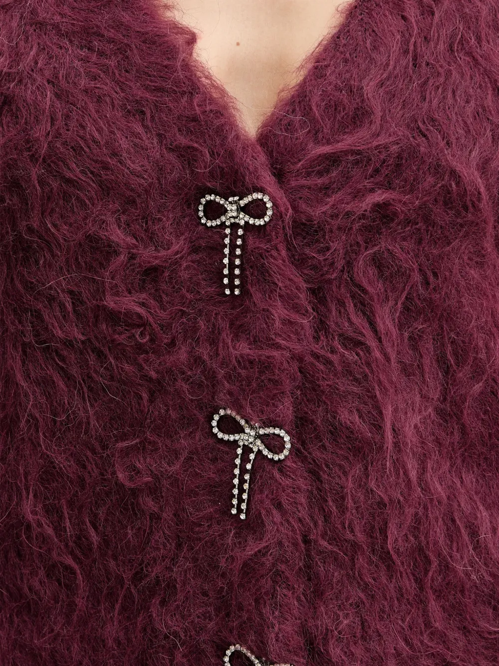 Темно-красный кардиган с V-образным вырезом, застежкой на пуговицы, длинными рукавами и пушистой текстурой