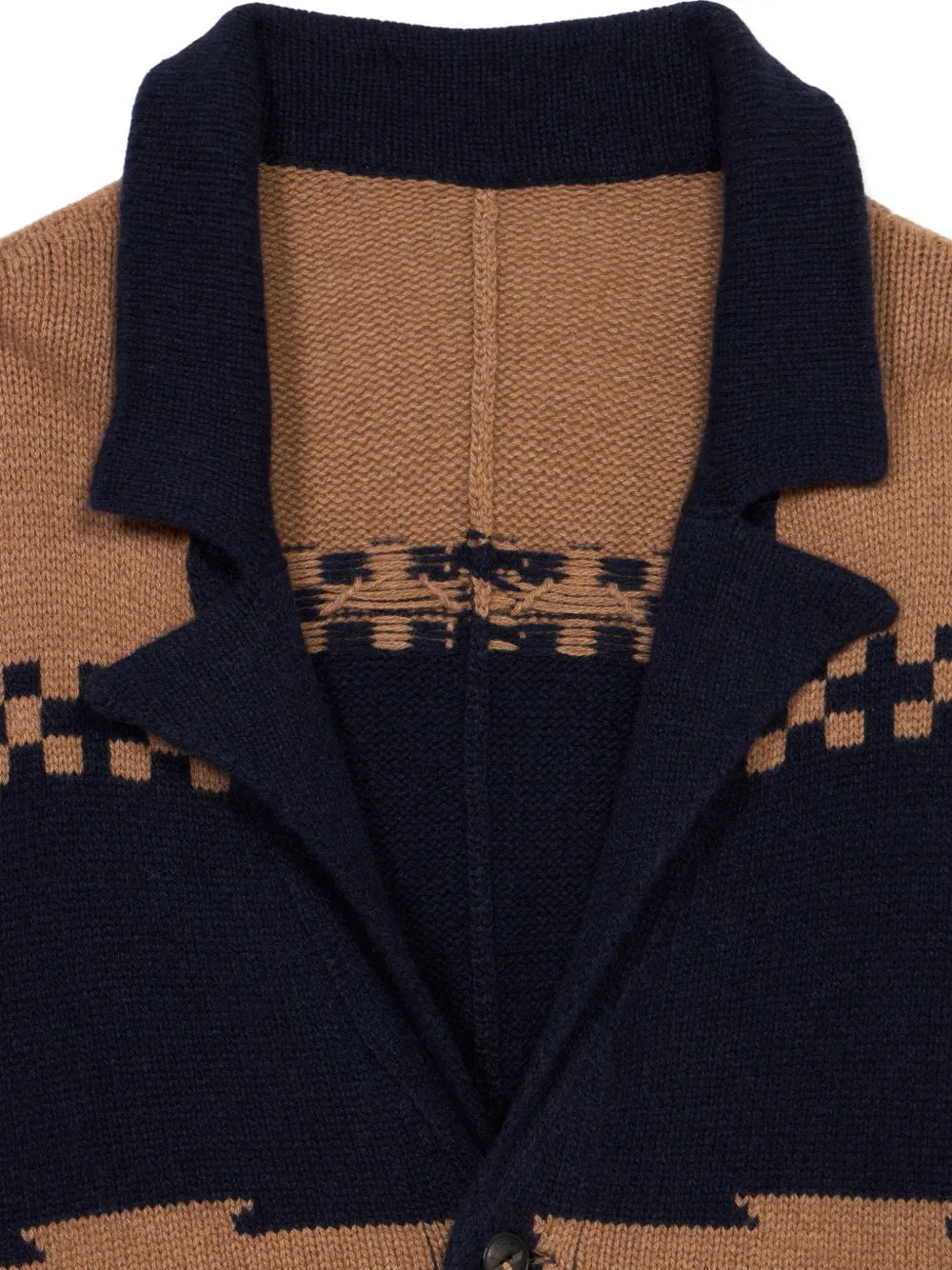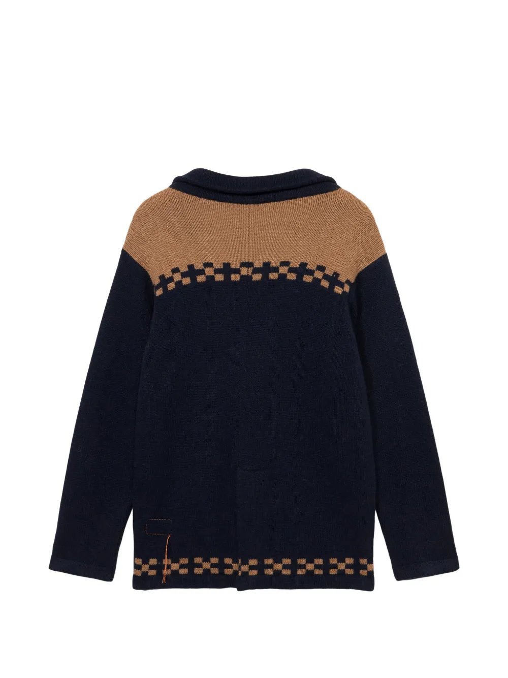 Синий жаккардовый дизайн, передние карманы, застежка на пуговицы, задний разрез, воротник-шаль