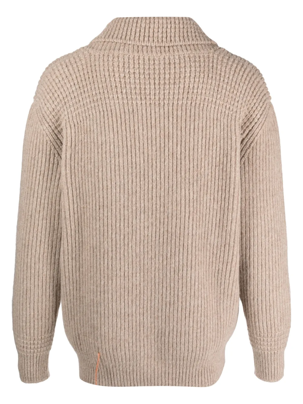 Бежево-коричневый, смесовая шерсть альпаки, трикотажный материал, трикотаж в крупный рубчик, шалевый воротник, застежка на пуговицах спереди, длинные рукава, два накладных кармана спереди и прямой подол.