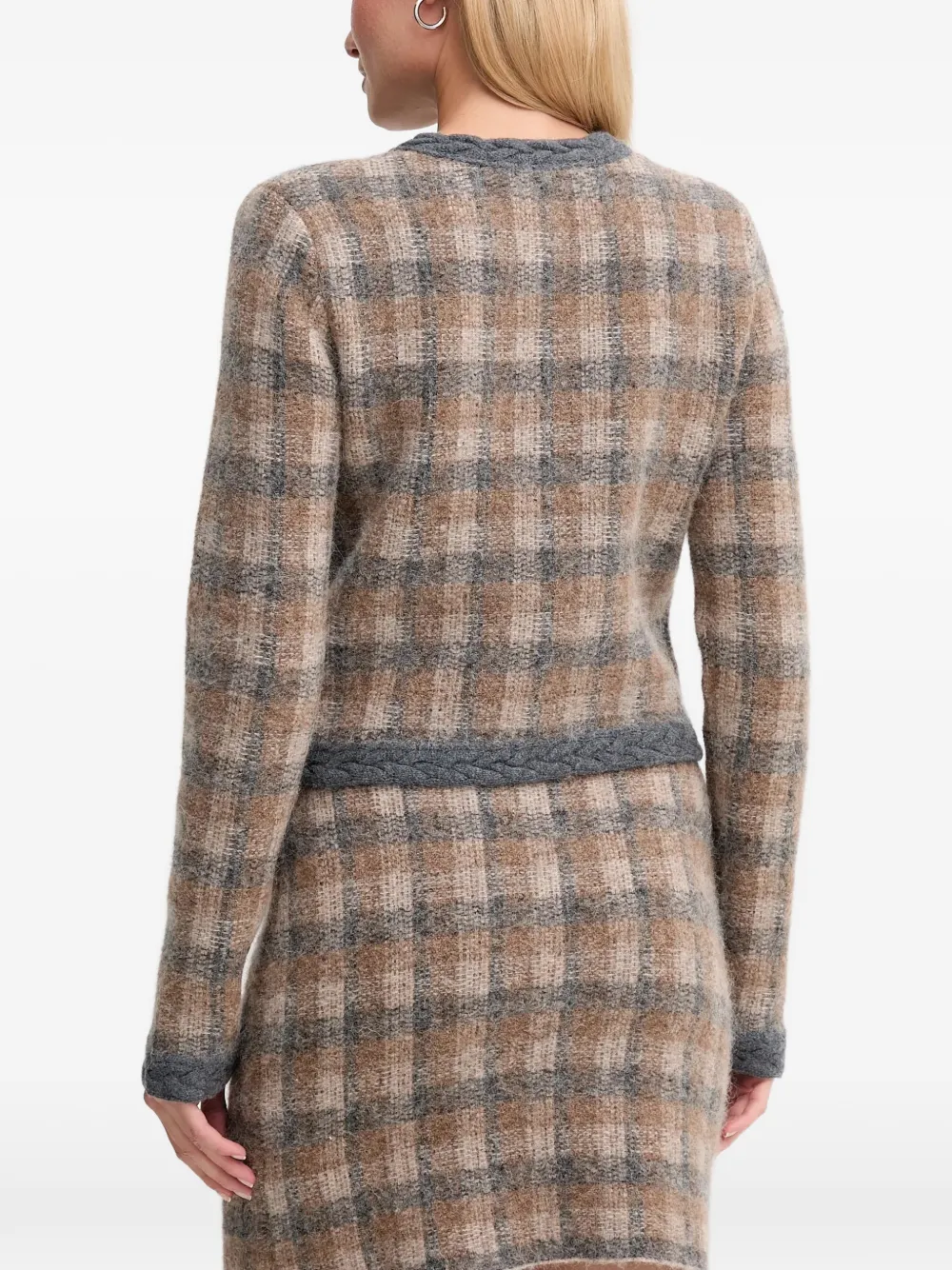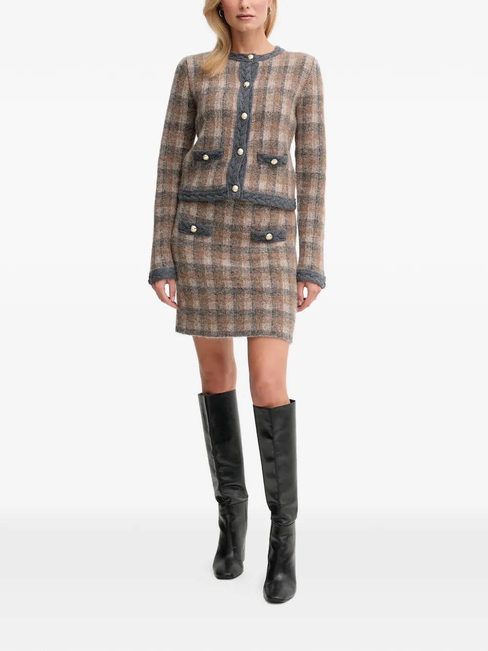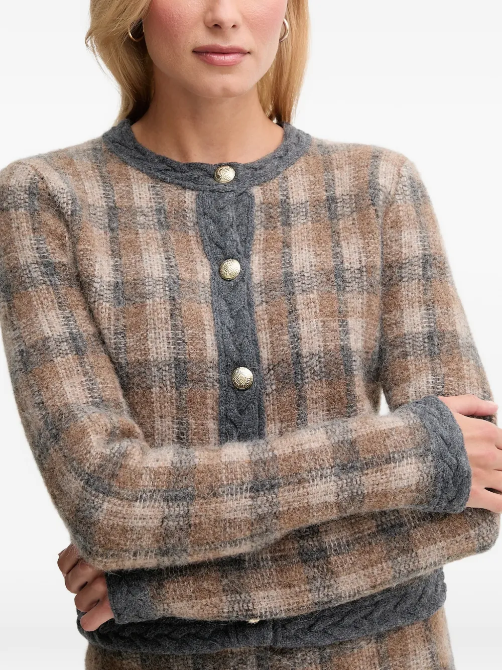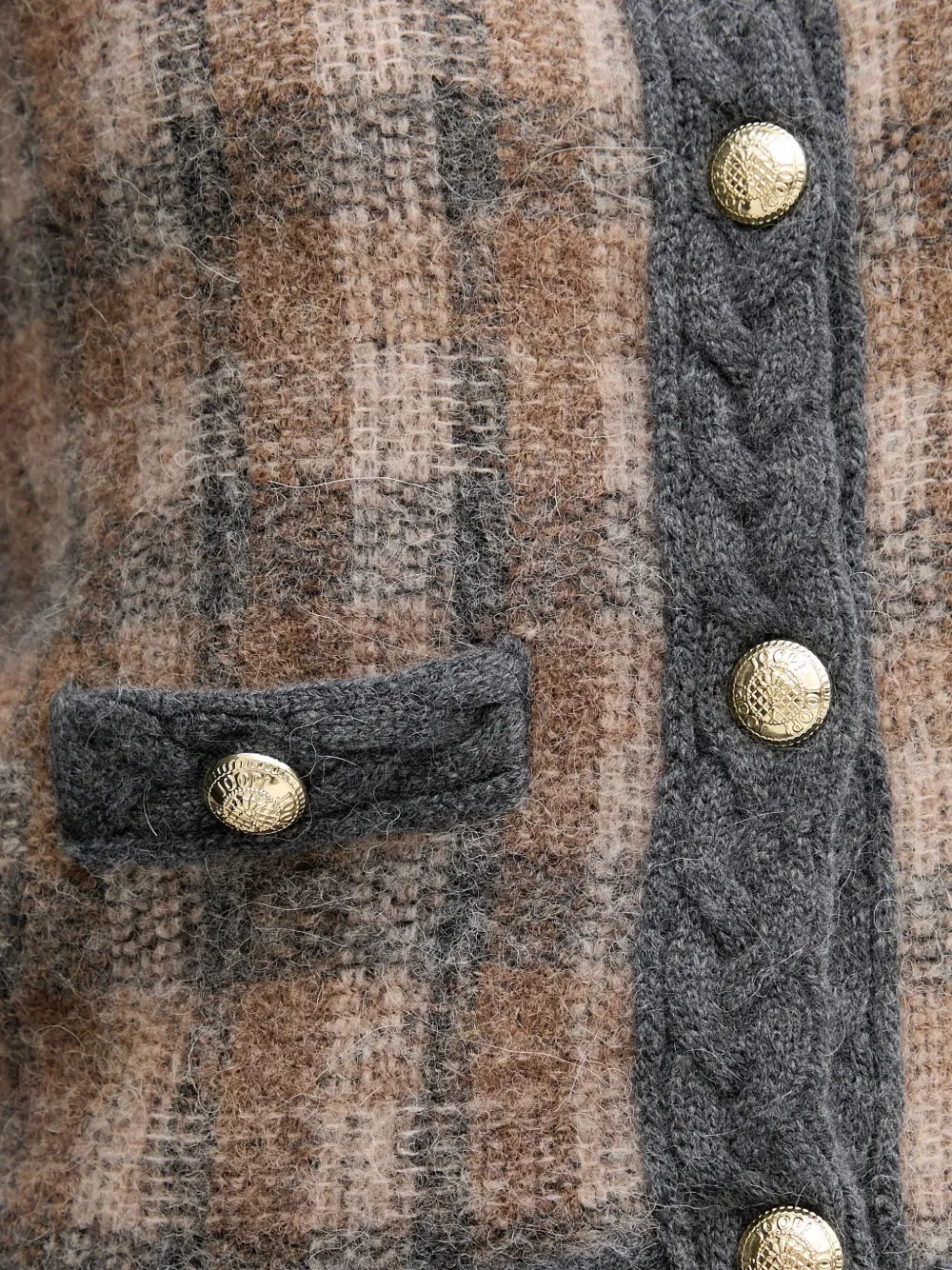 Бежевый в клетку, круглый вырез, застежка на пуговицы спереди, отделка вязаным жгутом, накладные карманы спереди