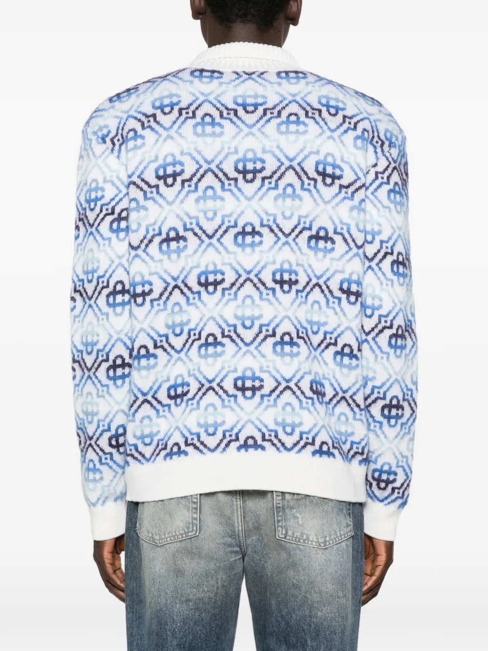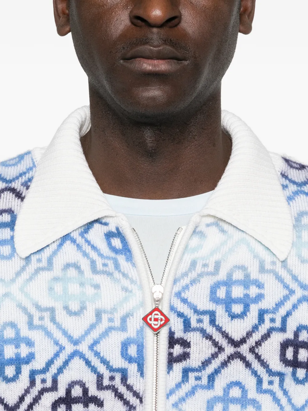 Белый и синий геометрический узор, застежка-молния, воротник с острыми концами, длинные рукава, манжеты в рубчик