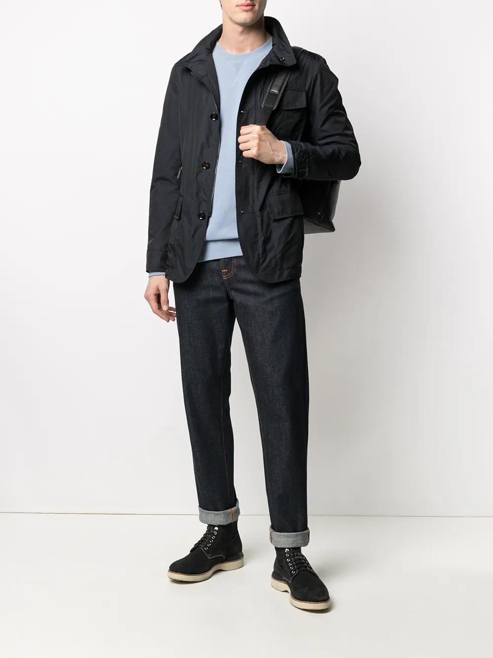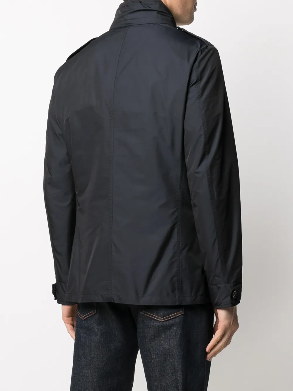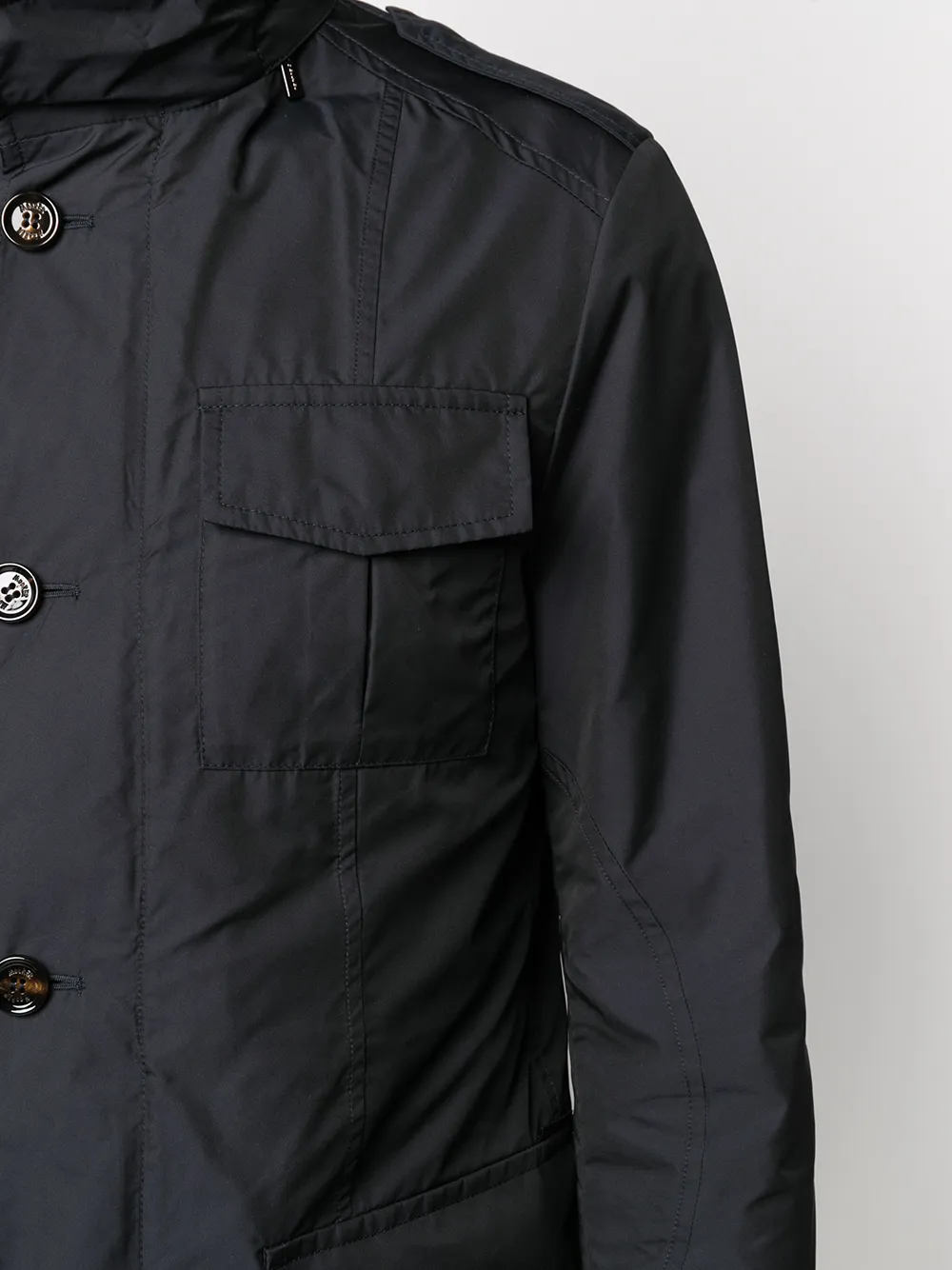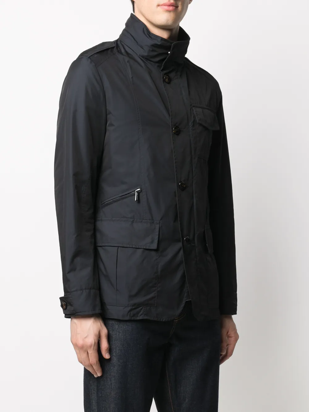 Высокий воротник, застежка на пуговицах спереди, длинные рукава и передние карманы с клапаном.