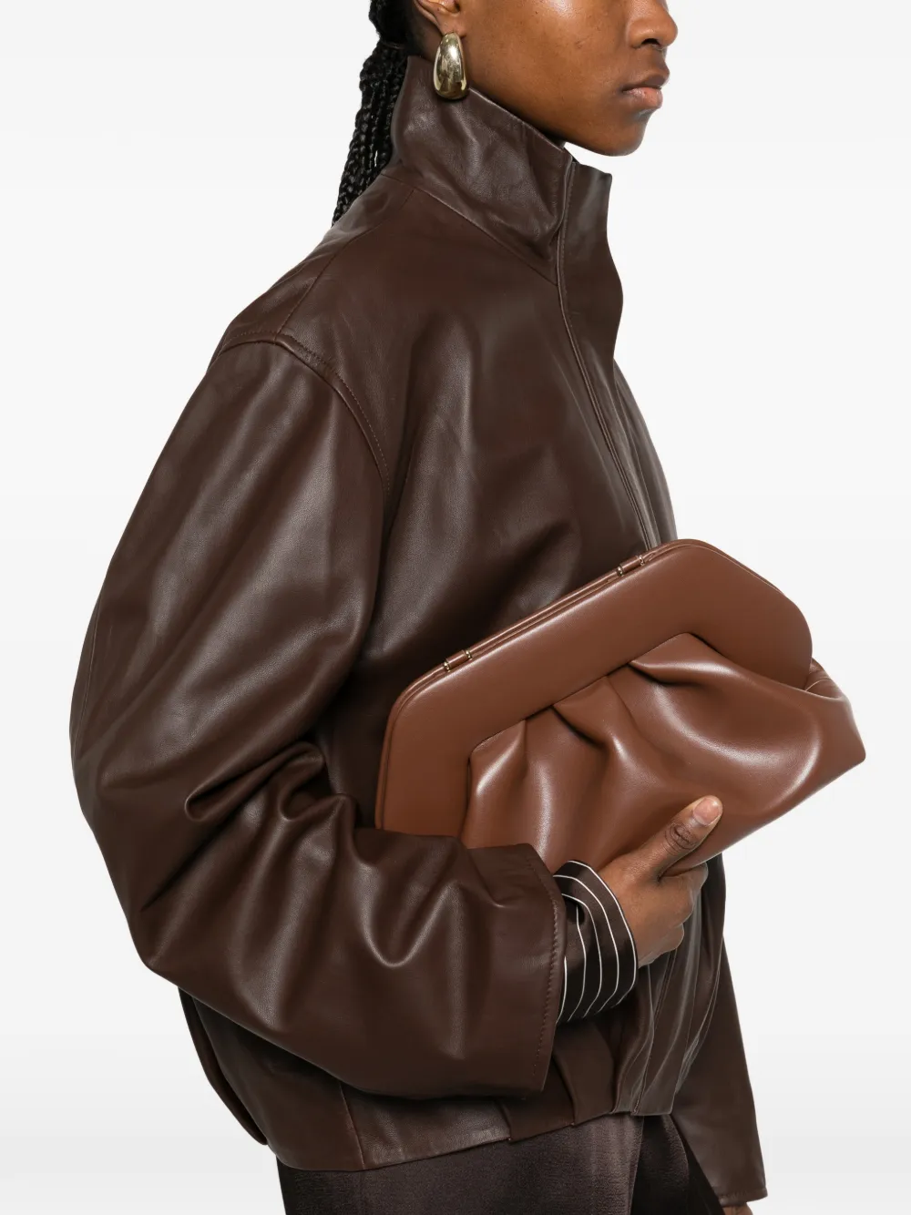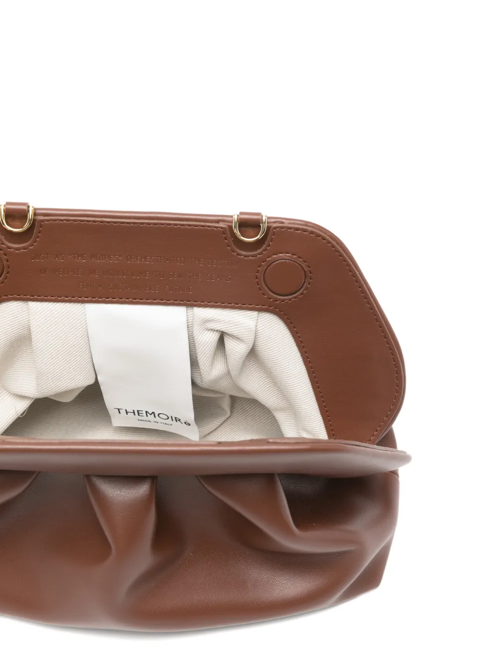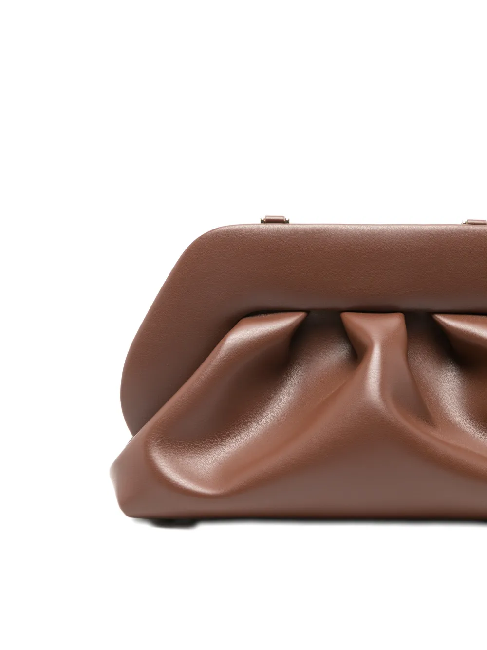 Коричневый, сборчатые детали, съемный регулируемый плечевой ремень. В комплекте защитный чехол для хранения.