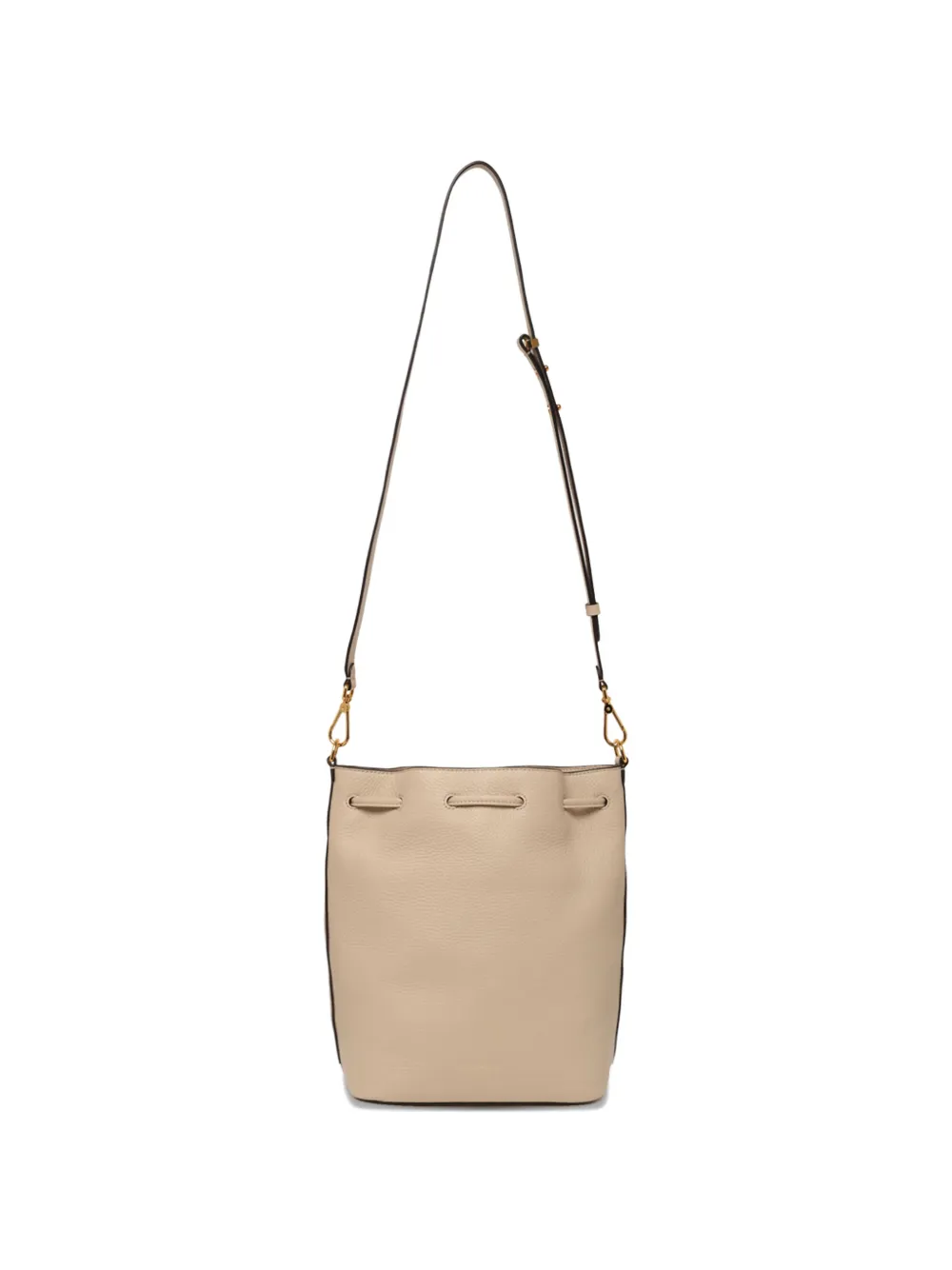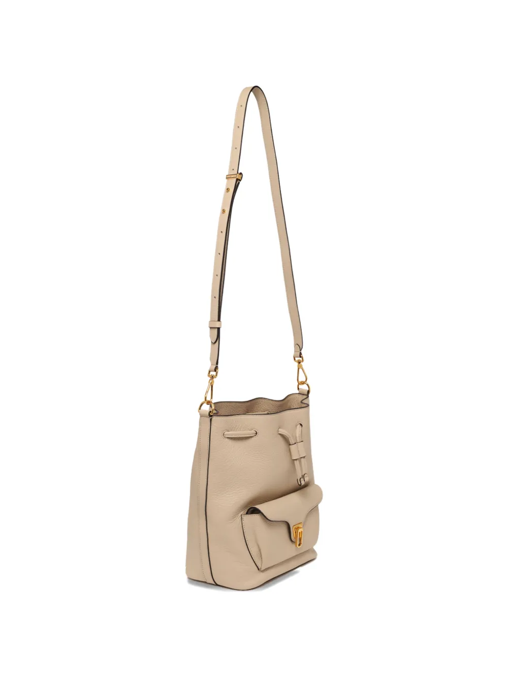 Песочно-бежевый цвет, застежка на шнурке, съемный плечевой ремень, фурнитура золотистого цвета, передний клапан-карман, основное отделение