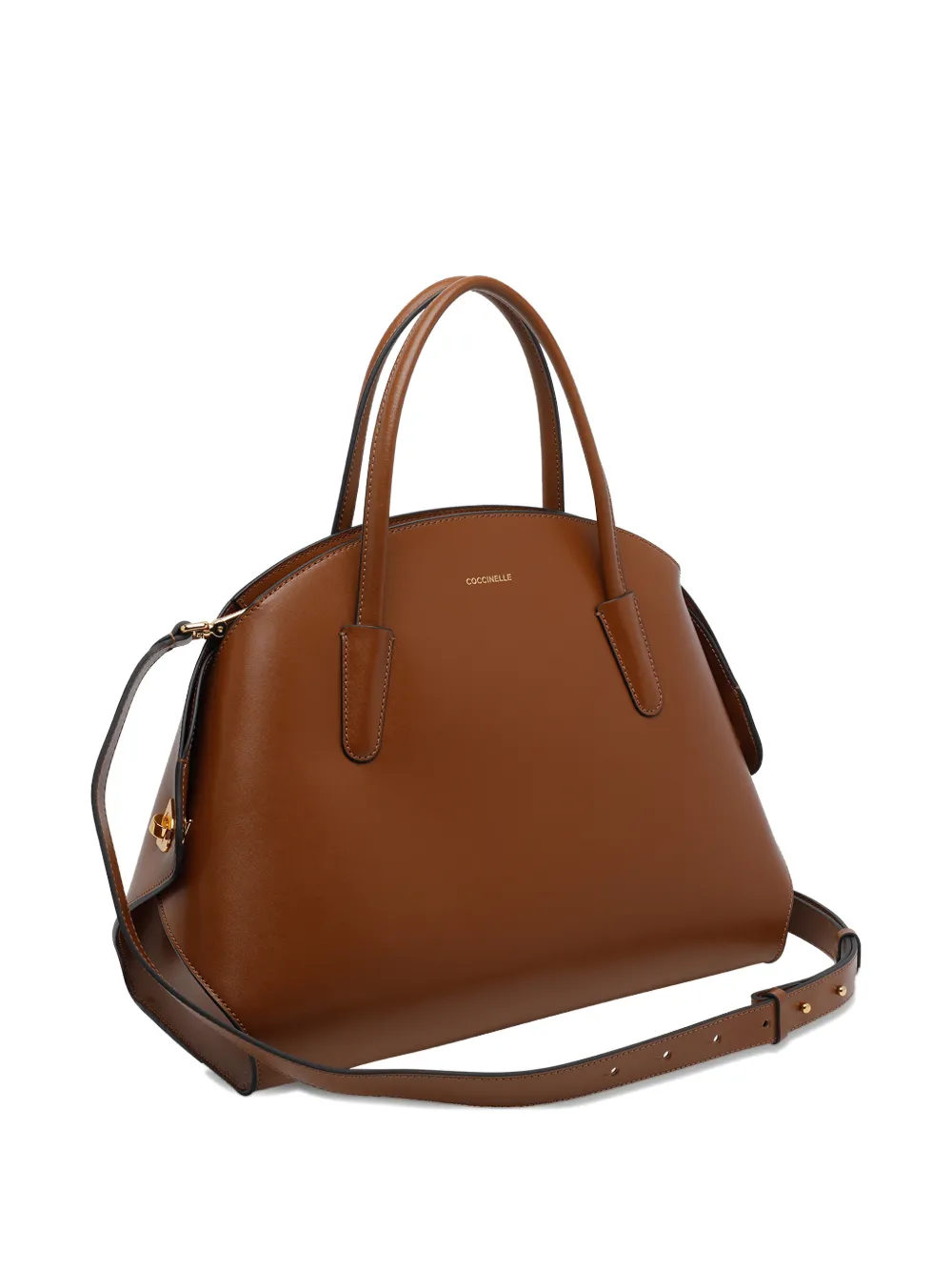 Коричневая телячья кожа, застежка-молния, съемный ремешок, логотип спереди, внутренний карман