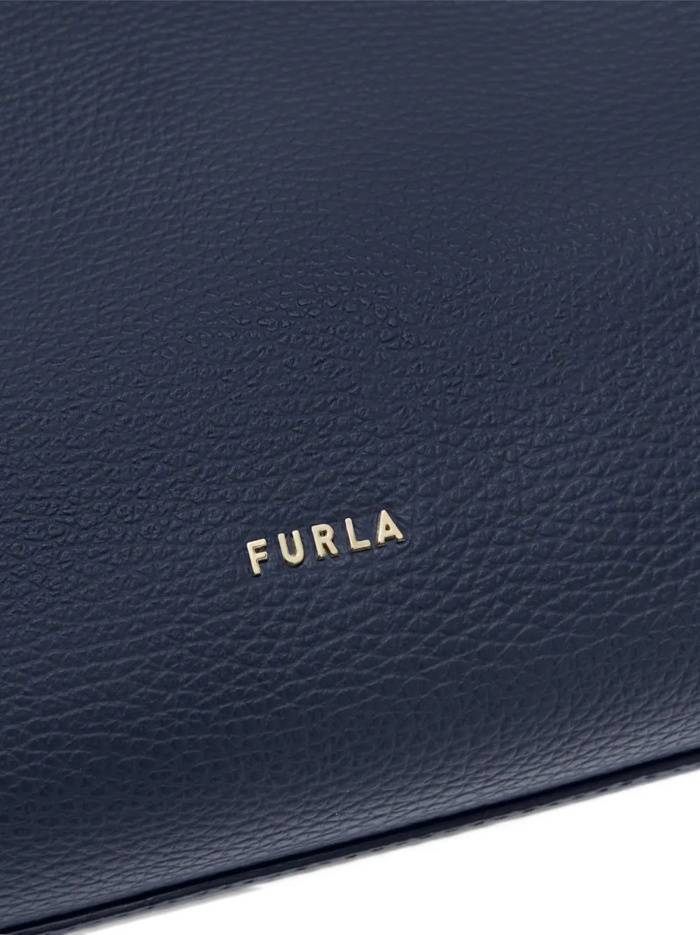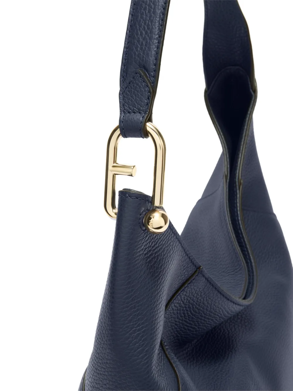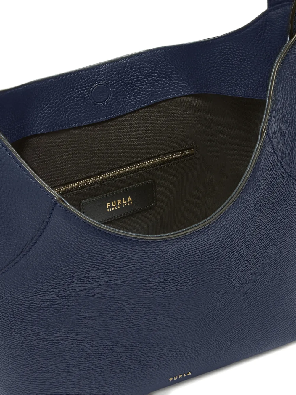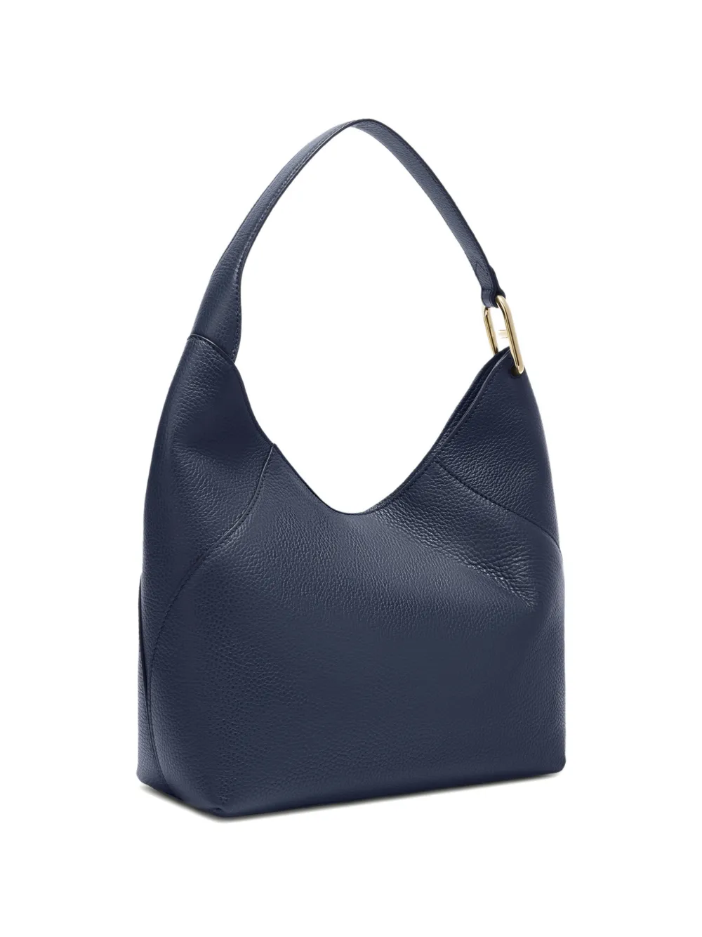 Синий с текстурированной отделкой, фурнитура золотистого оттенка, наплечный ремень, фирменная деталь (логотип)