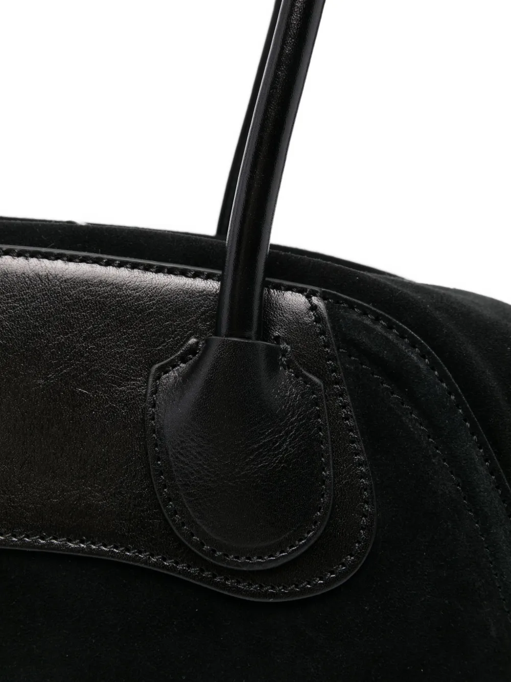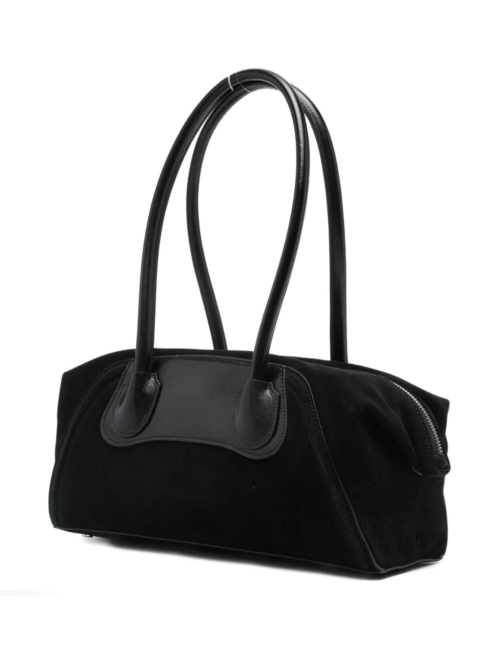 Черная замша, кожаная отделка, верхние ручки, застежка-молния, изогнутый силуэт