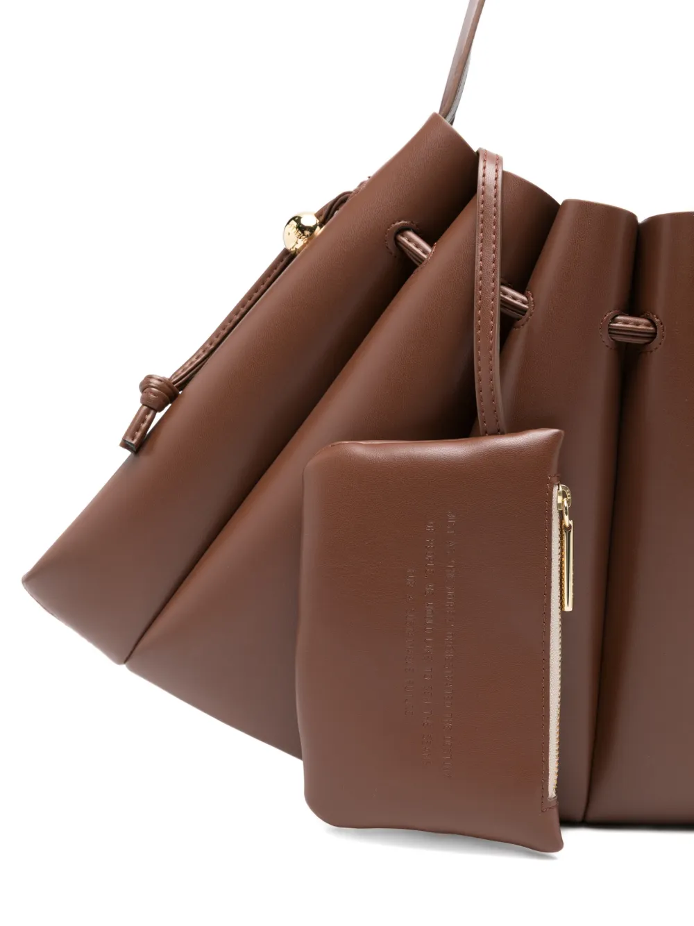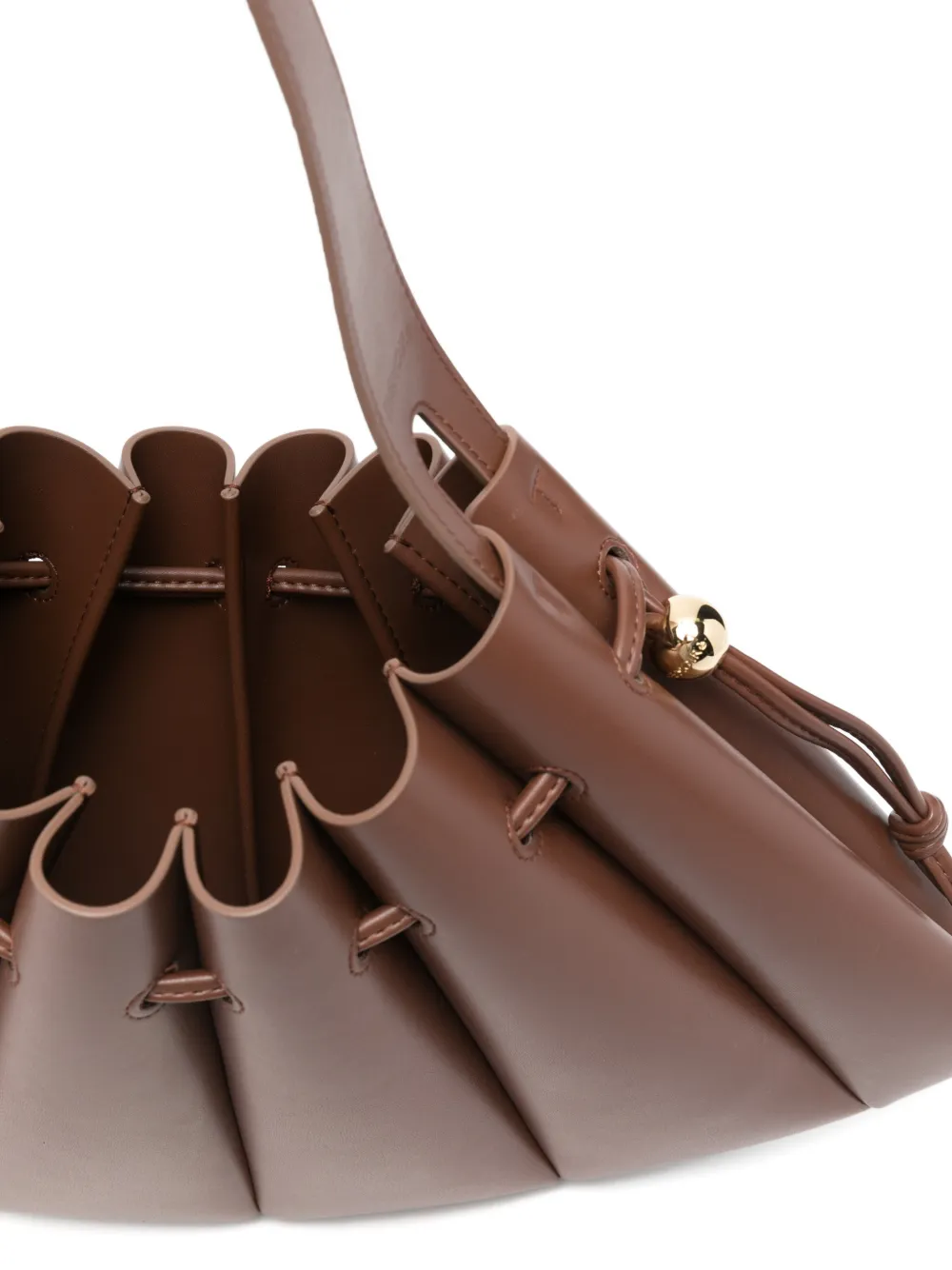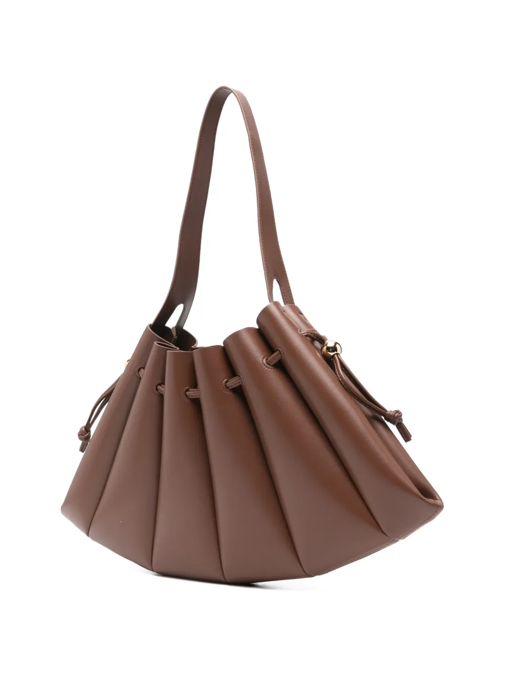 Коричневый цвет, сборка, одна наплечная лямка, застежка на кулиску, фурнитура золотистого оттенка. В комплект входит защитный чехол для хранения.